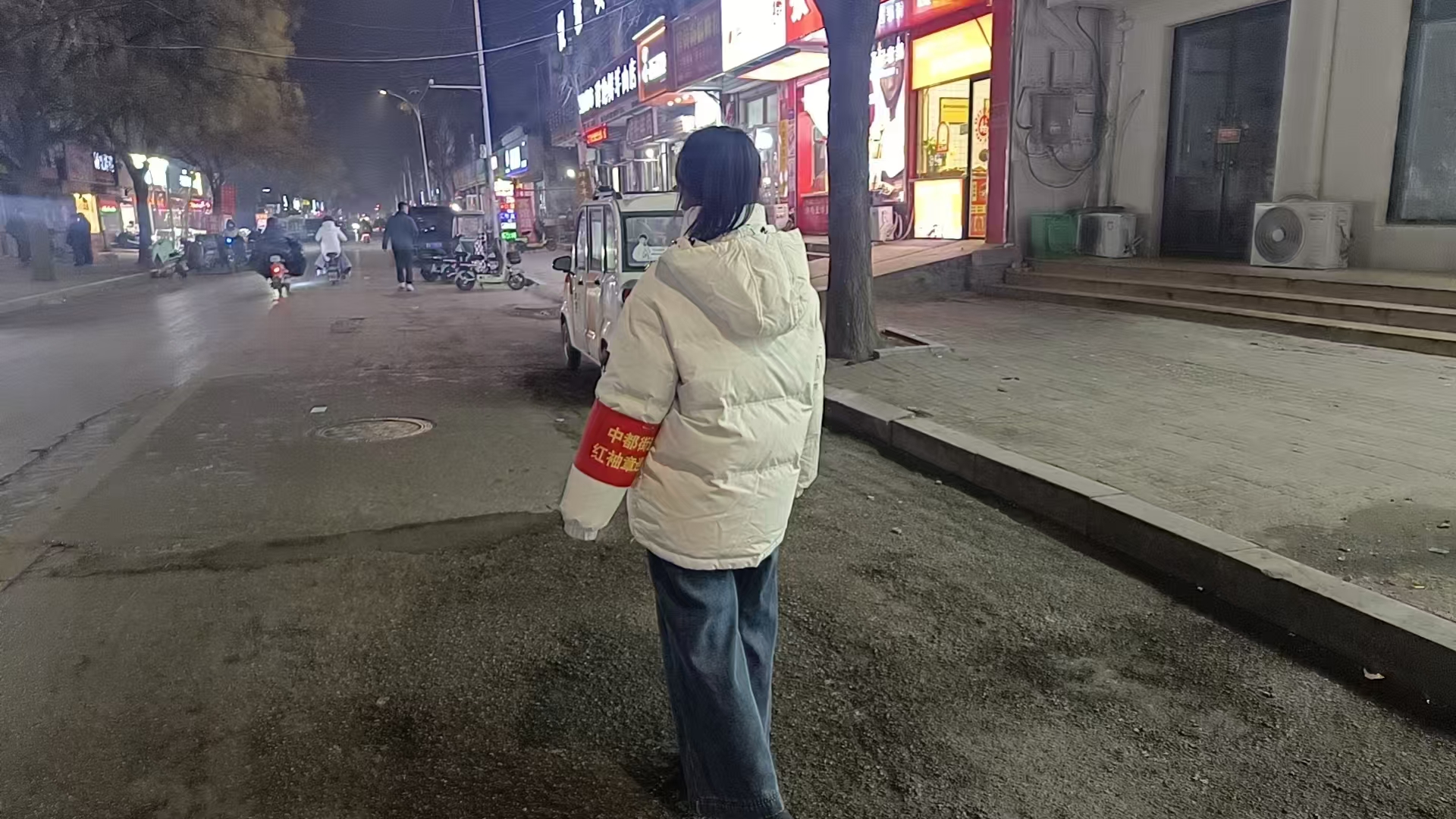 在现场可以看到,身着厚外套的志愿者站在街道旁,手臂上佩戴着醒目的“红袖章”,密切关注着周边的环境状况。此次夜间巡查涵盖了街道治安、交通秩序、消防安全等多个方面,工作人员不仅对辖区内的重点路段、商铺集中区域进行巡逻,还会及时提醒过往市民注意出行安全,向商户宣传消防安全知识,排查潜在的安全隐患。