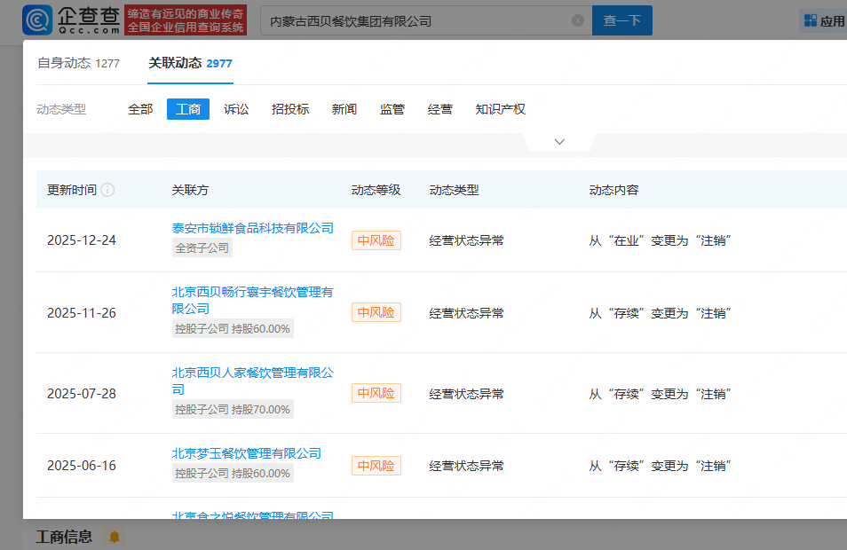 企查查APP显示,2025年,泰安市锁鲜食品科技有限公司、北京西贝畅行寰宇餐饮管理有限公司、北京西贝人家餐饮管理有限公司、北京梦玉餐饮管理有限公司等多家西贝子公司注销。