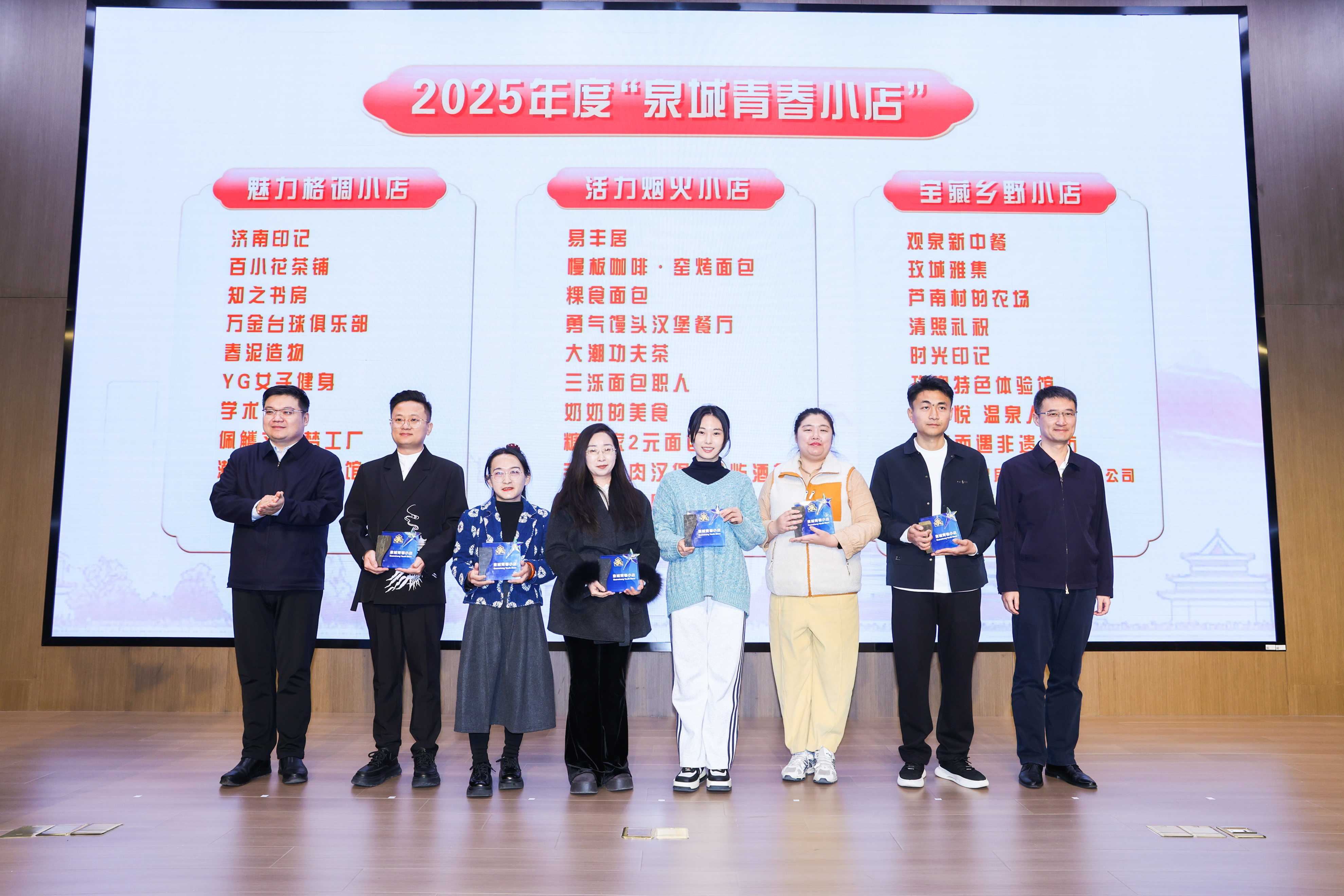年度“泉城青春小店”授牌:通过视频回顾了30家2025年度“泉城青春小店”的活力风采,共青团山东省委分管负责同志为到场的小店主理人代表颁发铭牌。来自百花洲文创集物社的主理人杜航与阡陌书店创始人郑国栋,分享了小店创业故事,展现了新时代青年创业者的情怀与才智。