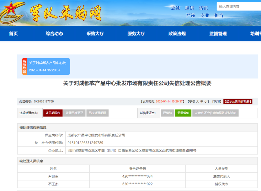 根据《关于对成都农产品中心批发市场有限责任公司失信处理公告》显示,经调查核实,成都农产品中心批发市场有限责任公司,在参加项目编号:2024-JQXTXN-W1003采购活动中,存在违规转包等违规行为。根据军队供应商管理相关规定,禁止3年内参加联勤保障部队范围物资工程服务采购活动的处罚。以上处理自2026年1月14日起算。
