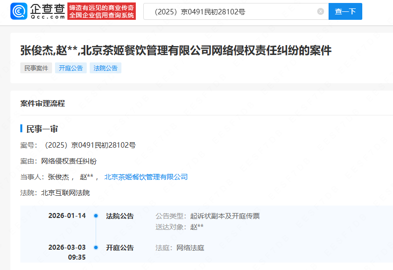 企查查APP显示,1月14日,北京互联网法院向赵某公告送达原告霸王茶姬关联公司北京茶姬餐饮管理有限公司、创始人张俊杰与其网络侵权责任纠纷案件起诉状副本、开庭传票等案件材料。据报道,此次维权案,主要为反击此前涉创始人的婚姻和创业的诸多谣言,是严惩造谣者的具体措施。