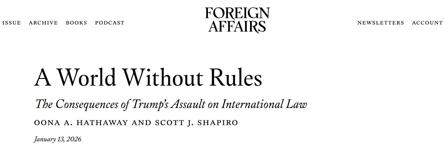 本届美国政府上台以来,不断采取单边主义行动。近期,美国不仅对委内瑞拉发动突然袭击,强行控制委内瑞拉总统马杜罗夫妇,扣押委内瑞拉石油资产,还声称将动用一切手段获得丹麦自治领地格陵兰岛。美国《外交事务》杂志近日刊发美国国际法学者的文章《一个没有规则的世界》,从国际法的角度分析了美国政府种种行为给国际秩序带来的危害。