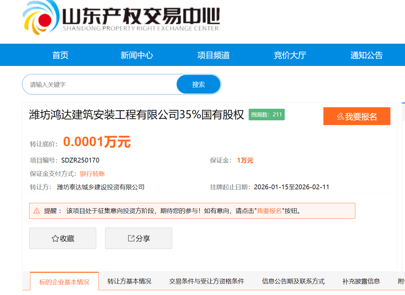 1月15日,潍坊泰达城乡建设投资有限公司以1元转让底价,在山东产权交易中心挂牌转让所持有的潍坊鸿达建筑安装工程有限公司35%国有股权,挂牌起止日期为1月15日至2月11日。