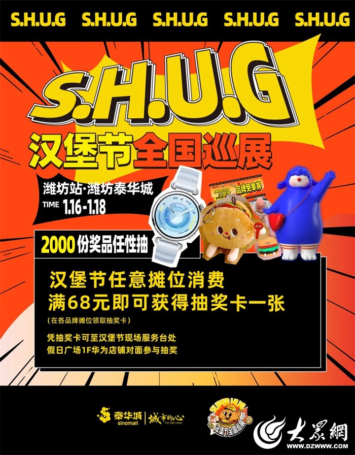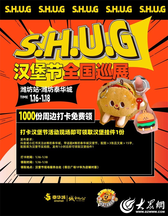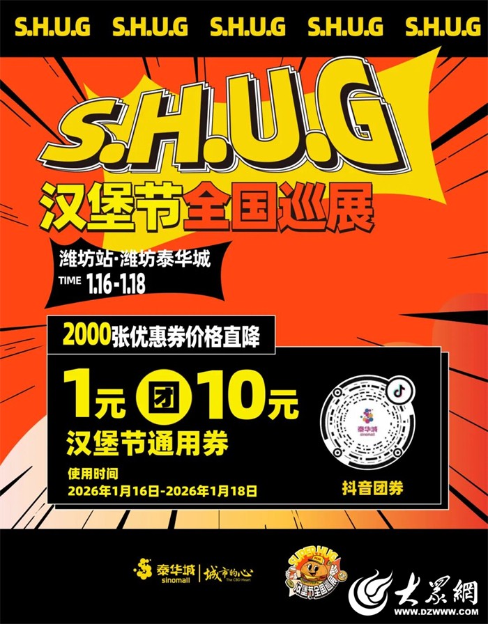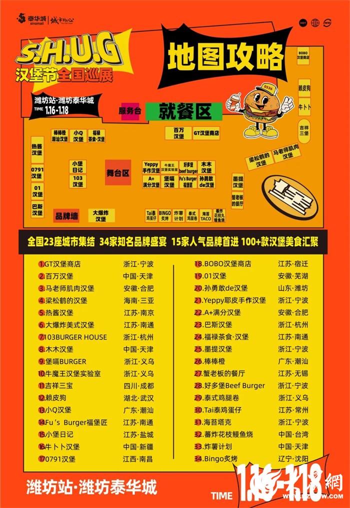 1月16日至18日,潍坊泰华城·假日广场北门将迎来一场属于汉堡爱好者的狂欢——“S.H.U.G汉堡节”全国巡展潍坊站。本次活动由潍坊泰华城主办,汇聚来自全国23座城市的34家人气汉堡品牌,其中15家为首次登陆潍坊,超百款汉堡将齐聚一堂,共同打造一场集美味、体验与文化于一体的城市美食盛宴。