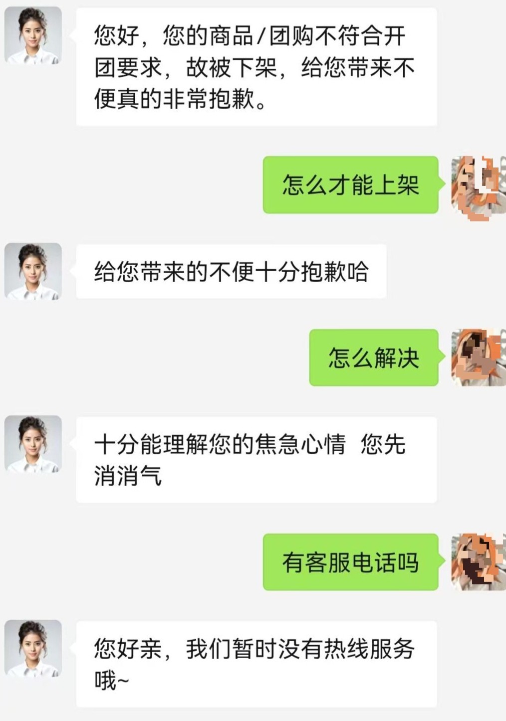 快团团上烘焙类食品被下架,商家只被通知违规但无解决方法,客服回应:消消气
