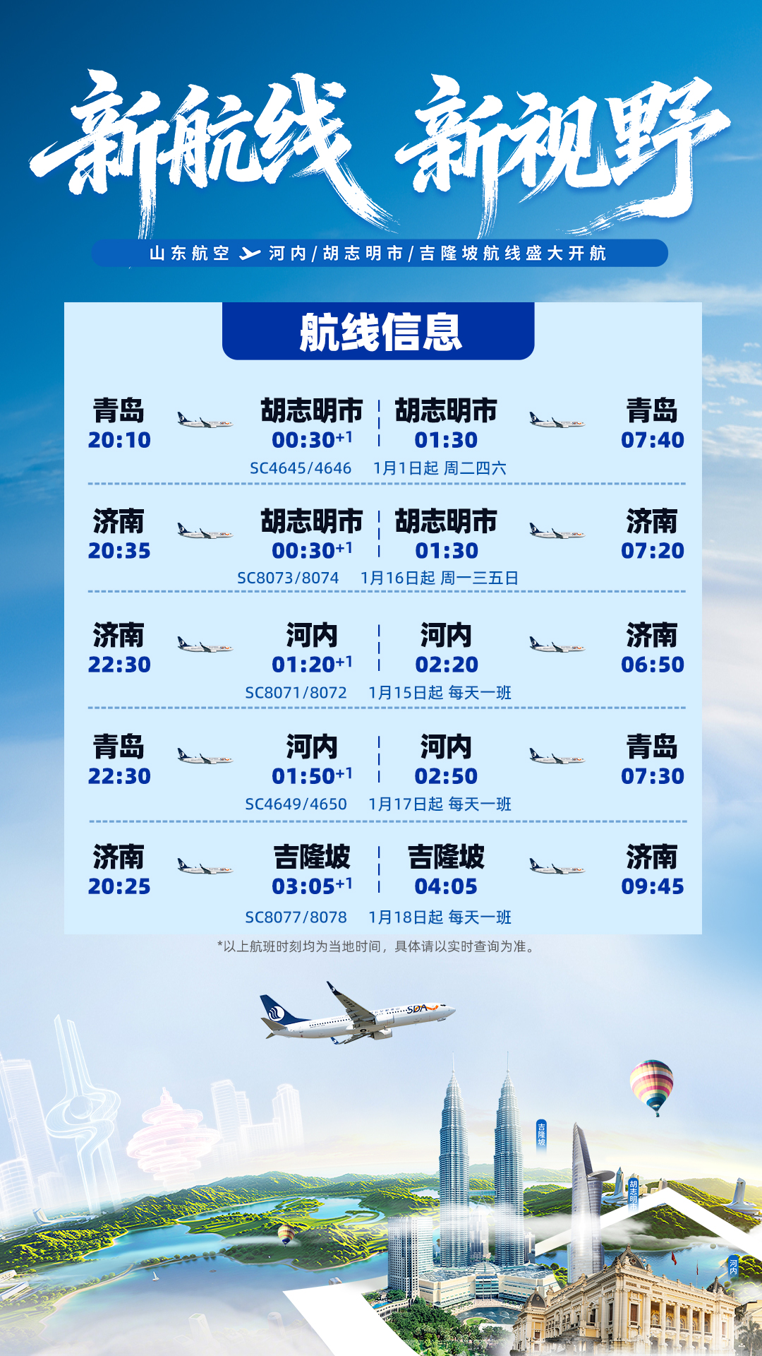 1月15日,济南遥墙国际机场内气氛热烈,山东航空“新航线・新视野”国际航线开航发布会在此举行。随着济南⇌河内、济南⇌胡志明市、济南⇌吉隆坡、青岛⇌胡志明市、青岛⇌河内五条航线正式宣告开通,山东与东南亚地区的空中通道全面升级。