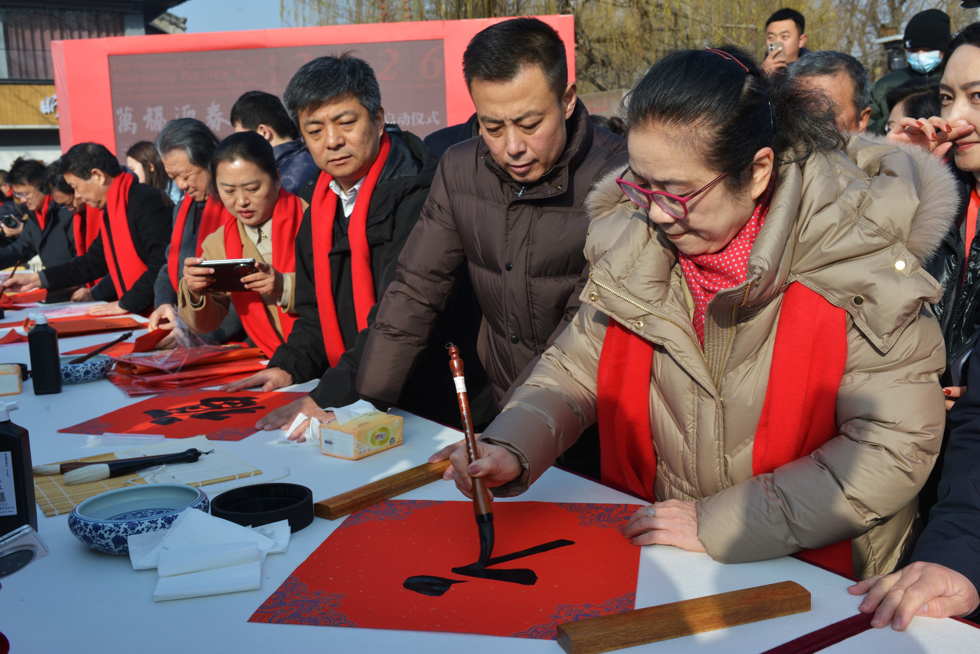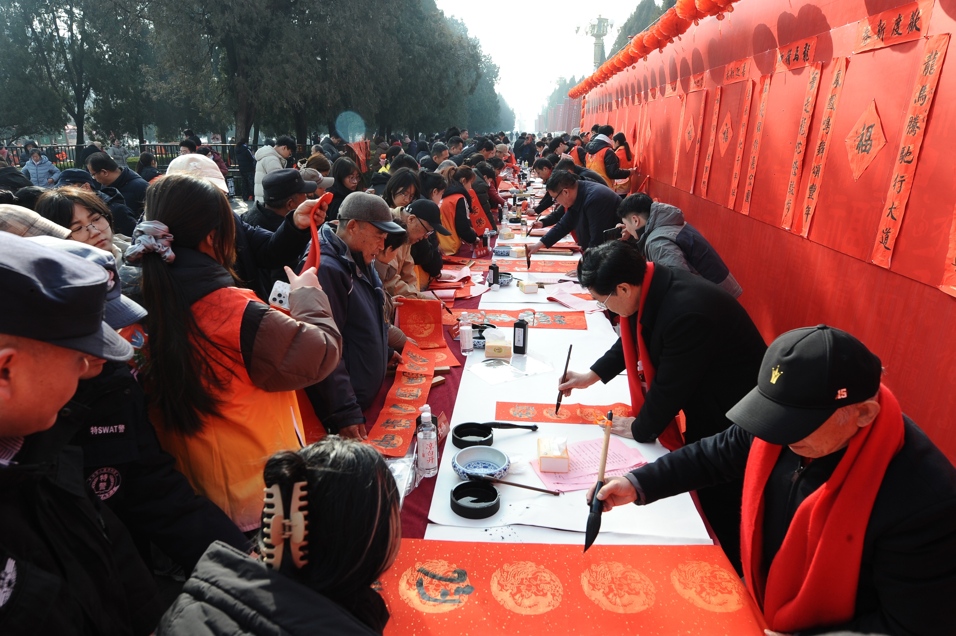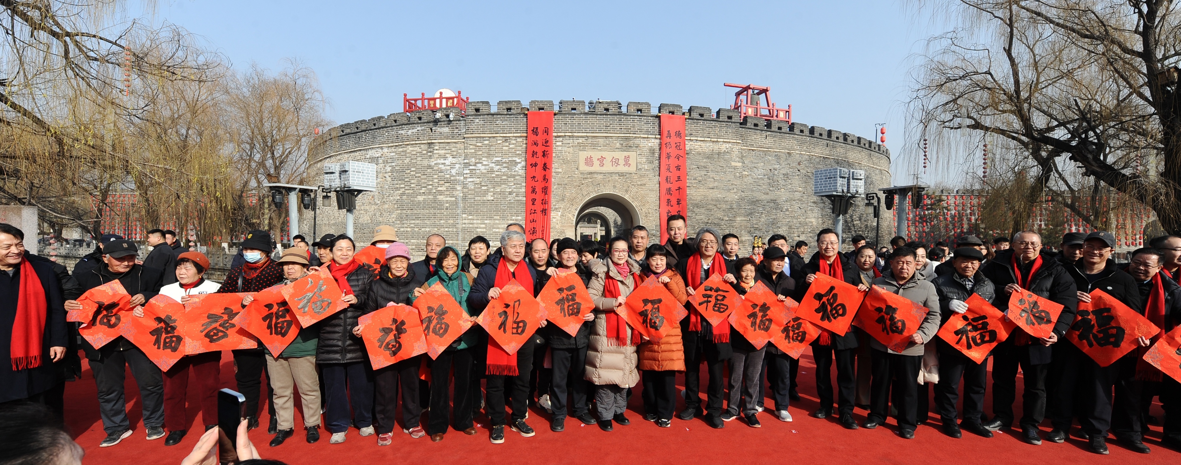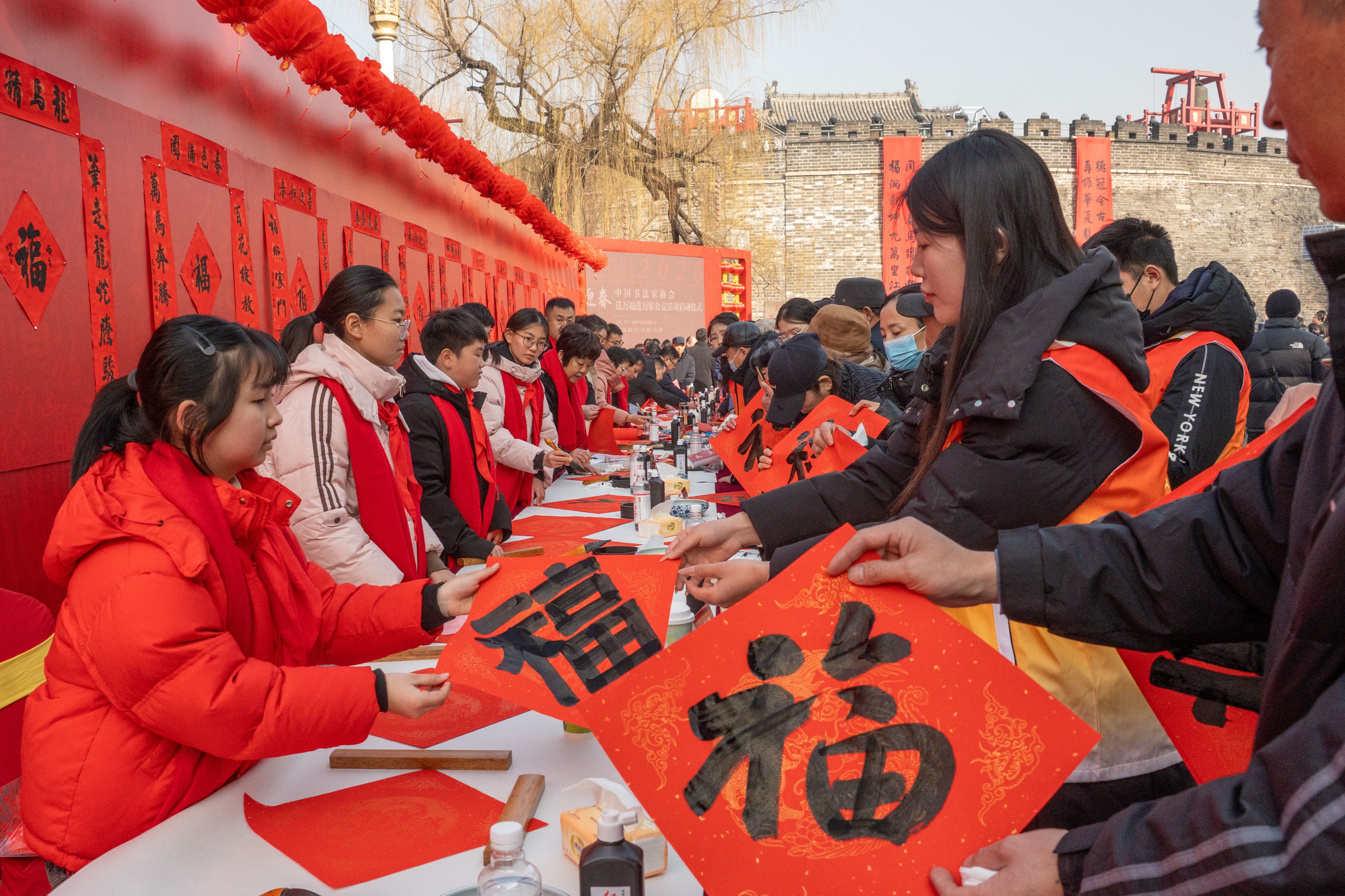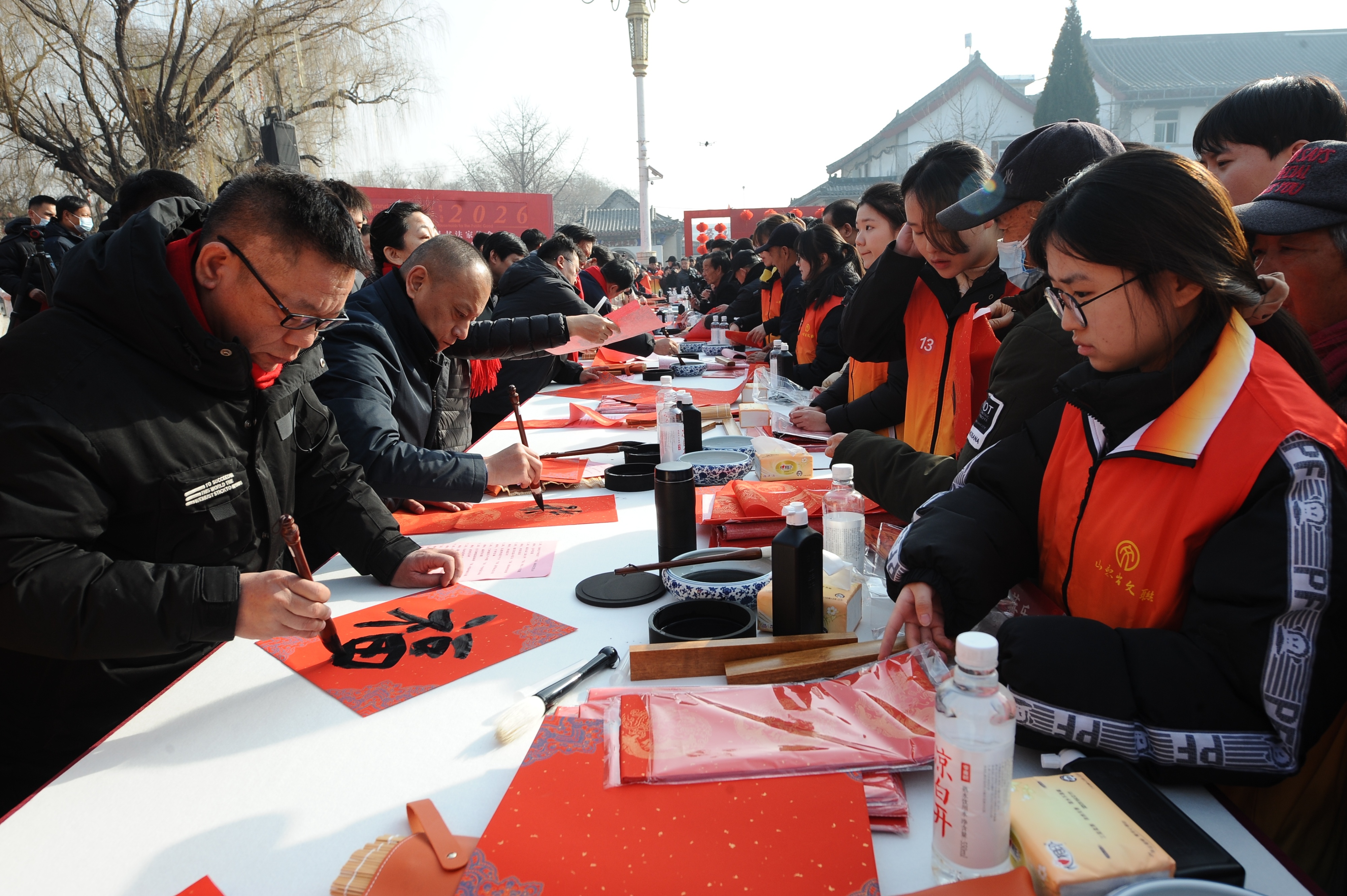 启动仪式前,曲阜当地文艺团体表演暖场节目《仁礼天下》,营造出喜庆祥和的新春氛围。在万仞宫墙前广场,中国书协、山东省书协、济宁市书协、曲阜市书协等四级书协的40名书法家与10名优秀青少年书法作者现场挥毫,为群众书写春联和“福”字,红纸墨香间暖意融融。