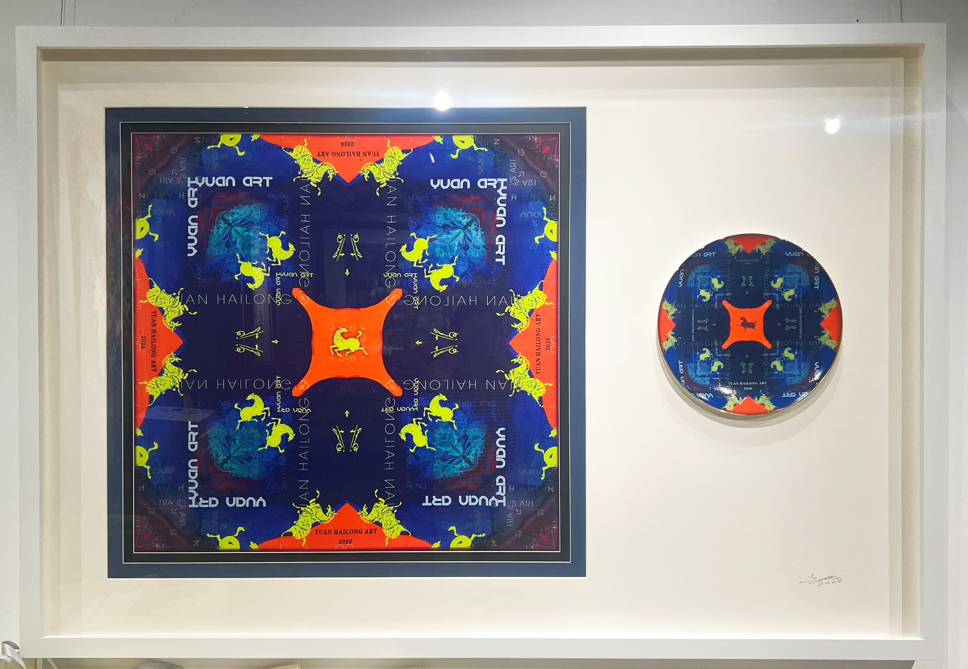 在袁海龙先生的工作室中,悬挂着一幅引人注目的丝巾作品。静谧的蓝与炽烈的橙在方寸之间交相辉映,源自汉代画像石的骏马形象跃然其上,在冷暖交织的色彩中勾勒出秩序与生机的对话。袁海龙认为,丝巾不仅是一件饰品,更是一幅“可穿戴的画”。他将绘画中的符号语言注入这方柔软织物之中,既保留了丝巾特有的精致质感,亦传递出其独特的色彩哲学与造型韵律,分外吸引人。