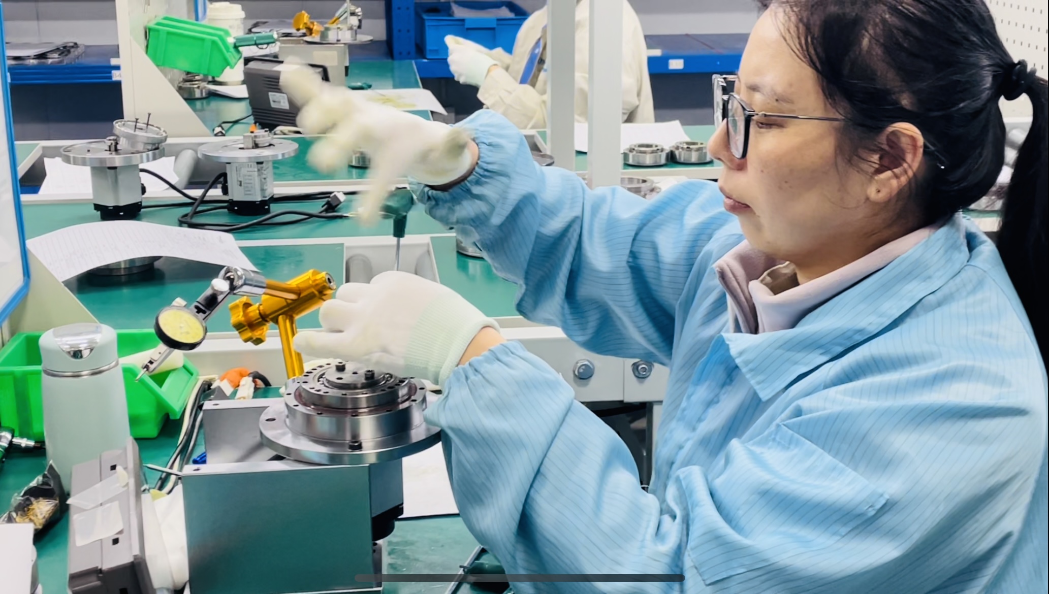 工作人员正在对谐波减速器进行质检。