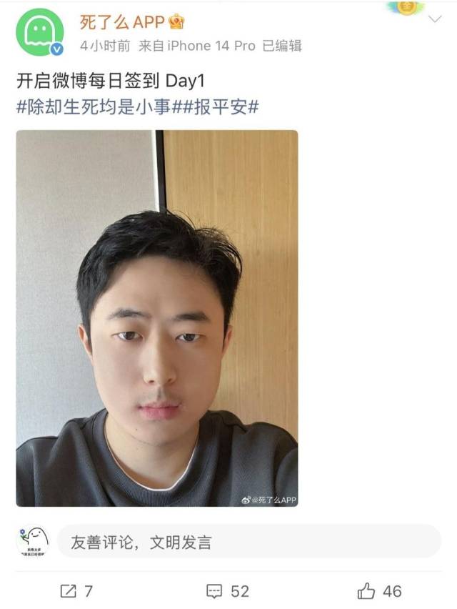 15日,“死了么”App账号发帖称,开启微博每日签到Day1,并附上“除却生死均是小事”“报平安”的话题,配了一张自拍照。另外,南都记者发现,“死了么”创始人吕先生的微信昵称增加了“决定公开露面”。