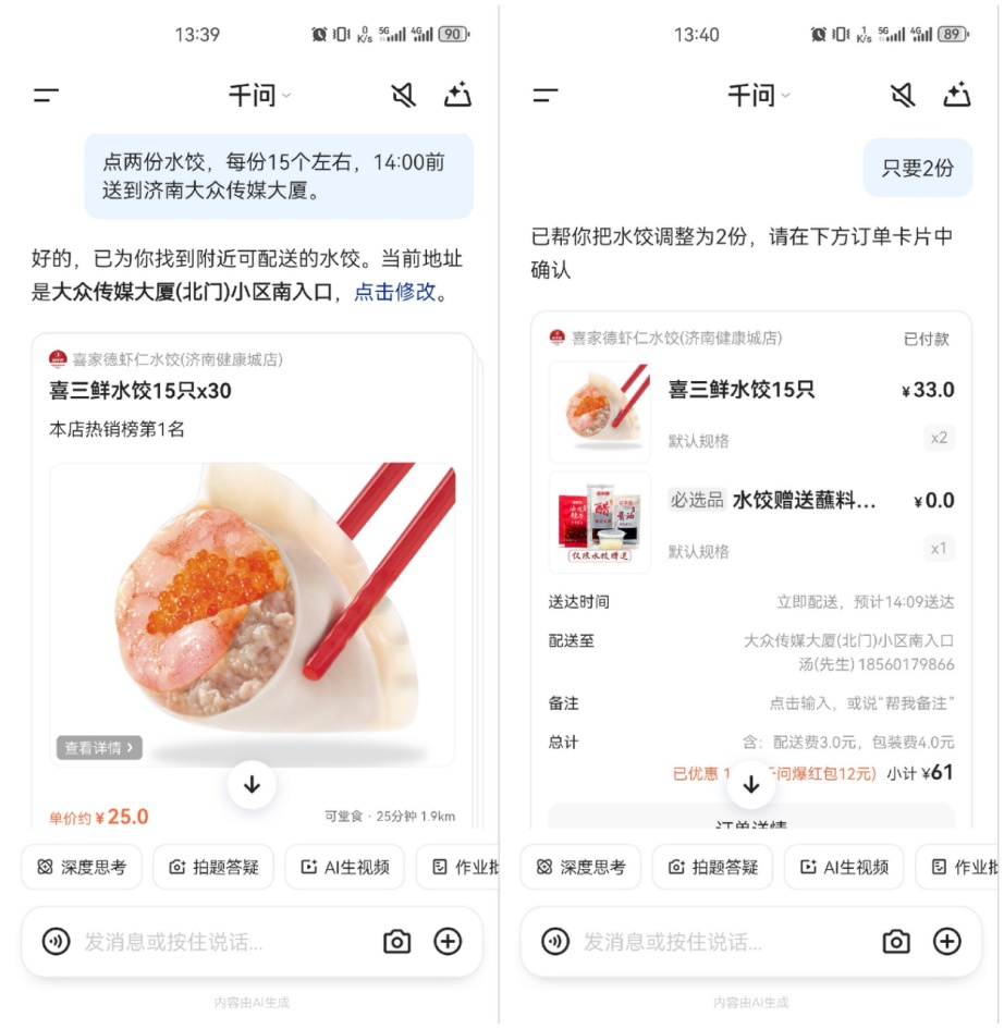 13:37 重新给千问下达指令“点两份水饺,每份15个左右,14:00前送到济南大众传媒大厦。”很快,千问给出水饺订单选项,点了下单按钮,发现订单金额1000多元。仔细检查发现千问把水饺自动选成了30份。“只要2份”,很快,订单更新成2份。看来AI也会开小差,指令明明是要两份,却给订了30份,看来真是理解卖家扩大销售的急切心情。