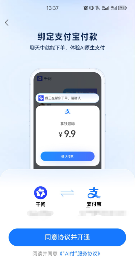 13:38 在生成的订单下面,点击“支付宝付款”按钮,千问立刻唤起绑定支付宝付款页面。完成绑定后用支付宝完成了支付。