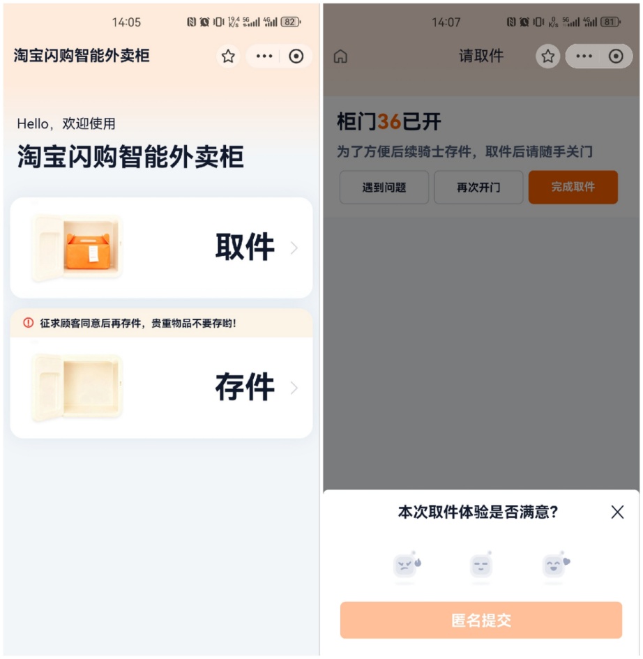 14:05 来到单位楼下快递柜,发现是淘宝闪购智能外卖柜,看来阿里的这个生态链还真是挺完备。用支付宝扫码取了餐。