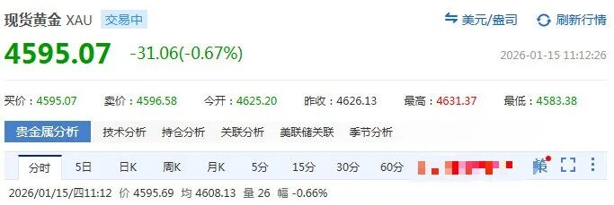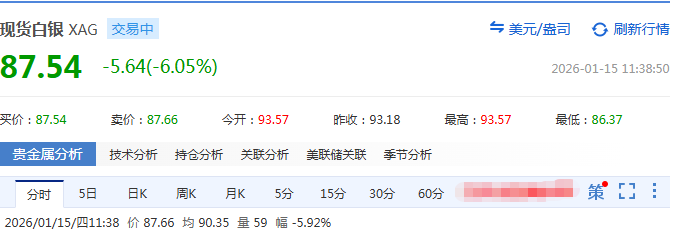 15日早盘,现货白银短线快速跳水,跌幅一度扩大至7%,跌破88美元/盎司,截至11时38分,下跌6.05%。现货黄金一度失守4600美元/盎司,日内跌超0.6%,COMEX黄金跌幅扩大至0.7%。