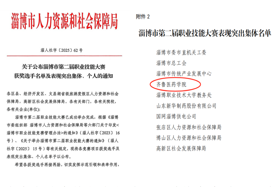 近日,淄博市人力资源和社会保障局正式发布《关于公布淄博市第二届职业技能大赛获奖选手名单及表现突出集体、个人的通知》,齐鲁医药学院荣获“淄博市第二届职业技能大赛表现突出集体”称号,体现了学校在服务地方技能人才培养、推动职业技能高质量发展方面的积极贡献与综合实力。
