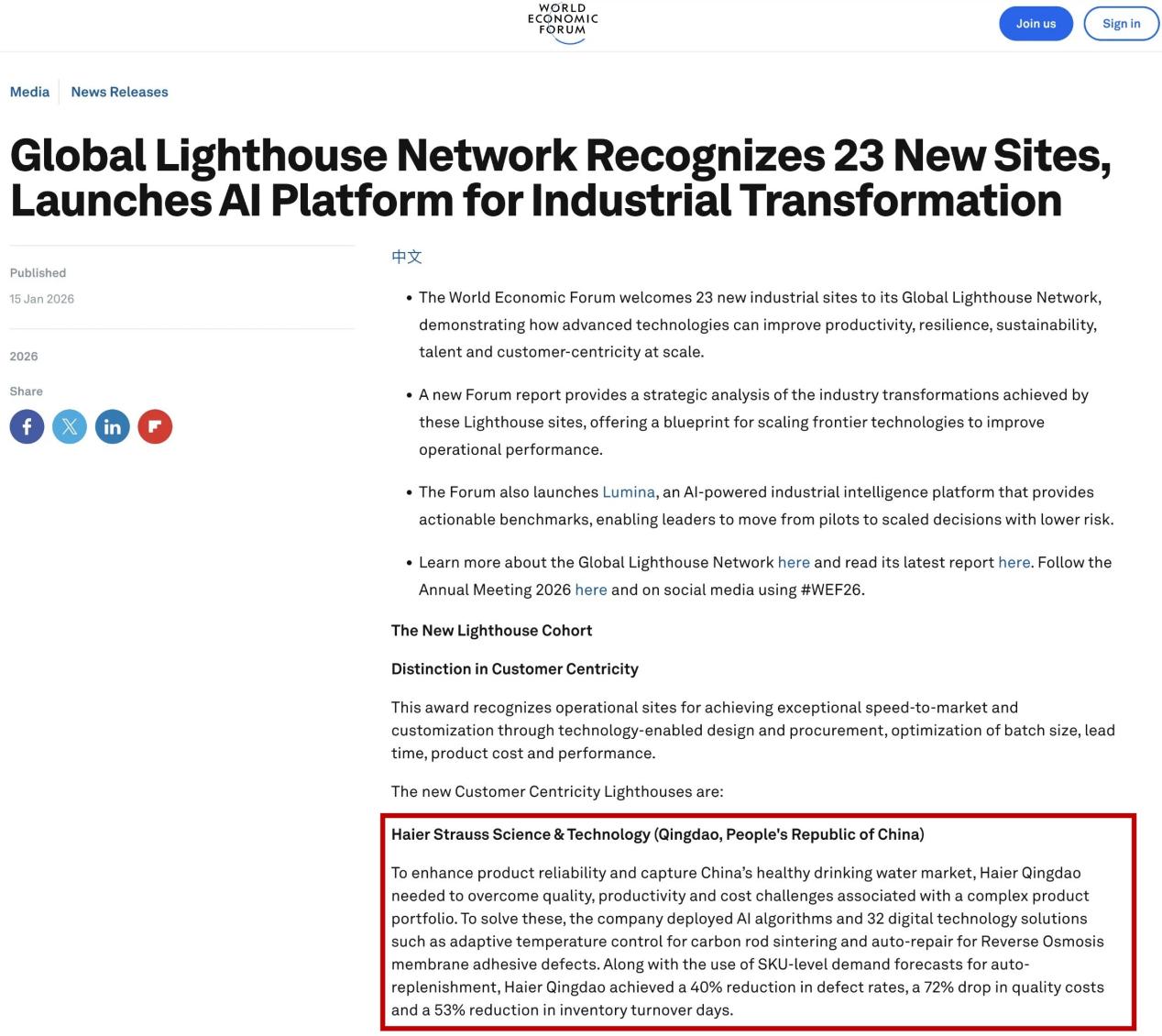 在宣布新晋灯塔工厂的同时,世界经济论坛还发布了年度白皮书《全球灯塔网络:大规模增强韧性与影响力的运营转型路径》,海尔上海洗衣机互联工厂和海尔重庆冰箱互联工厂双案例入选,成为全球制造业中将AI融入生产和价值链、推动数字化转型规模化发展的标杆案例。