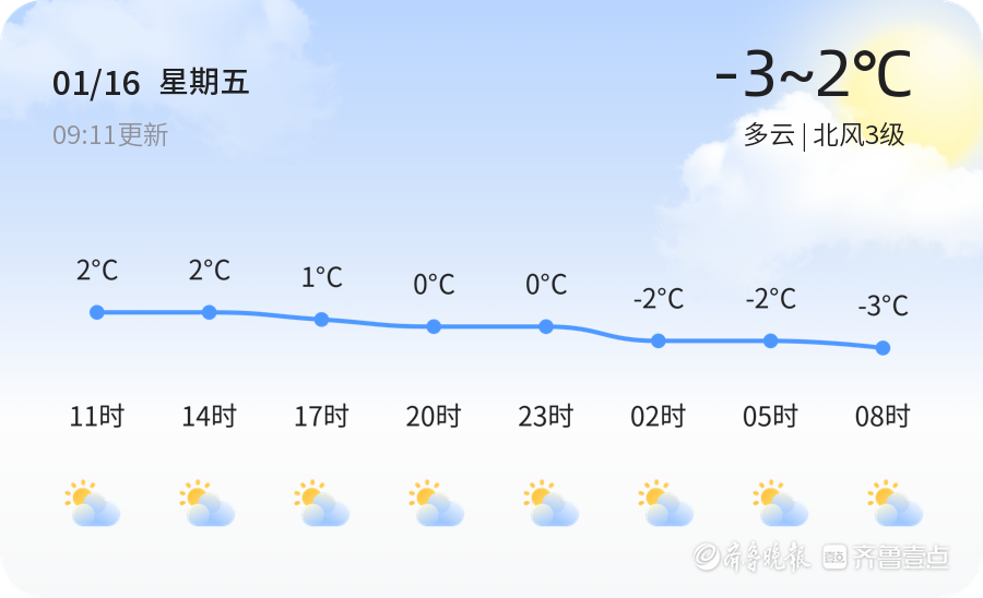 今天是1月16日,农历十一月廿八,星期五。滨州今天以多云天气为主,气温在-3℃到2℃之间,北风3级,空气湿度90%,PM2.5指数为114。各区天气情况总体平稳,但市民仍需注意保暖。