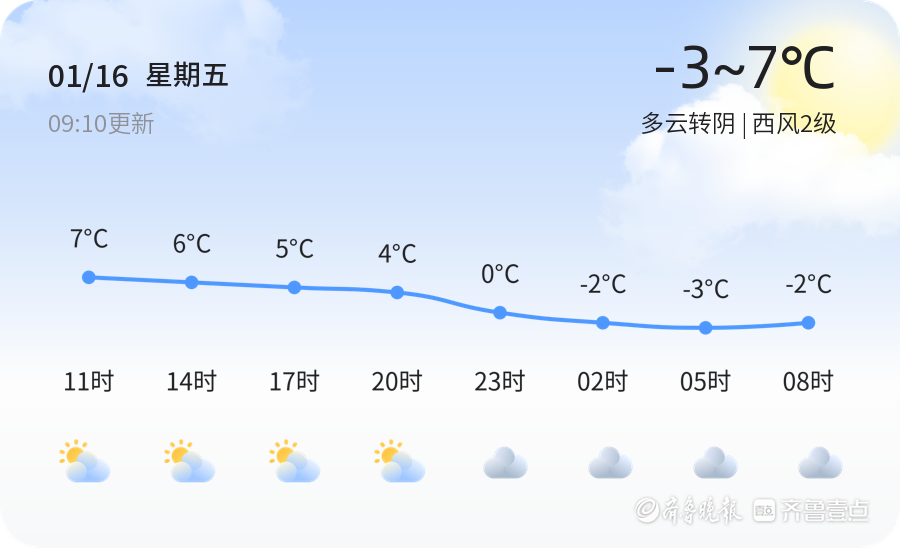今天是1月16日,星期五,农历十一月廿八。威海市今日天气多云转阴,气温范围在-3℃至7℃之间,西风2级,空气湿度为73%,PM2.5指数为82,空气质量状况为良。今日天气较为寒冷,风力较大,市民出行时请注意增添衣物,做好防风保暖措施,尤其是早晨和傍晚时段,气温较低,需特别注意保暖。