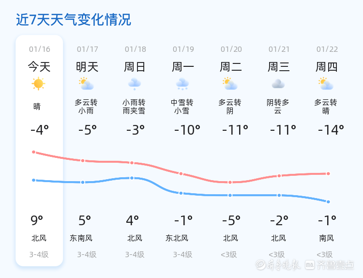 今天是2026年1月16日,星期五,农历十一月廿八。济宁市今天天气晴朗,气温为4.2℃,北风1级,空气湿度为67%,PM2.5指数为137。各区的天气情况总体保持一致,均为晴天,最高气温9℃,最低气温-4℃,风力较小,适合市民外出活动。