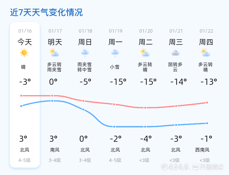 今天是1月16日,星期五,农历十一月廿八。泰安市今天天气晴朗,气温在-3℃到3℃之间。各区天气情况总体平稳,北风2级,空气湿度为58%,PM2.5指数为127。市民们在享受冬日阳光的同时,也需注意保暖。