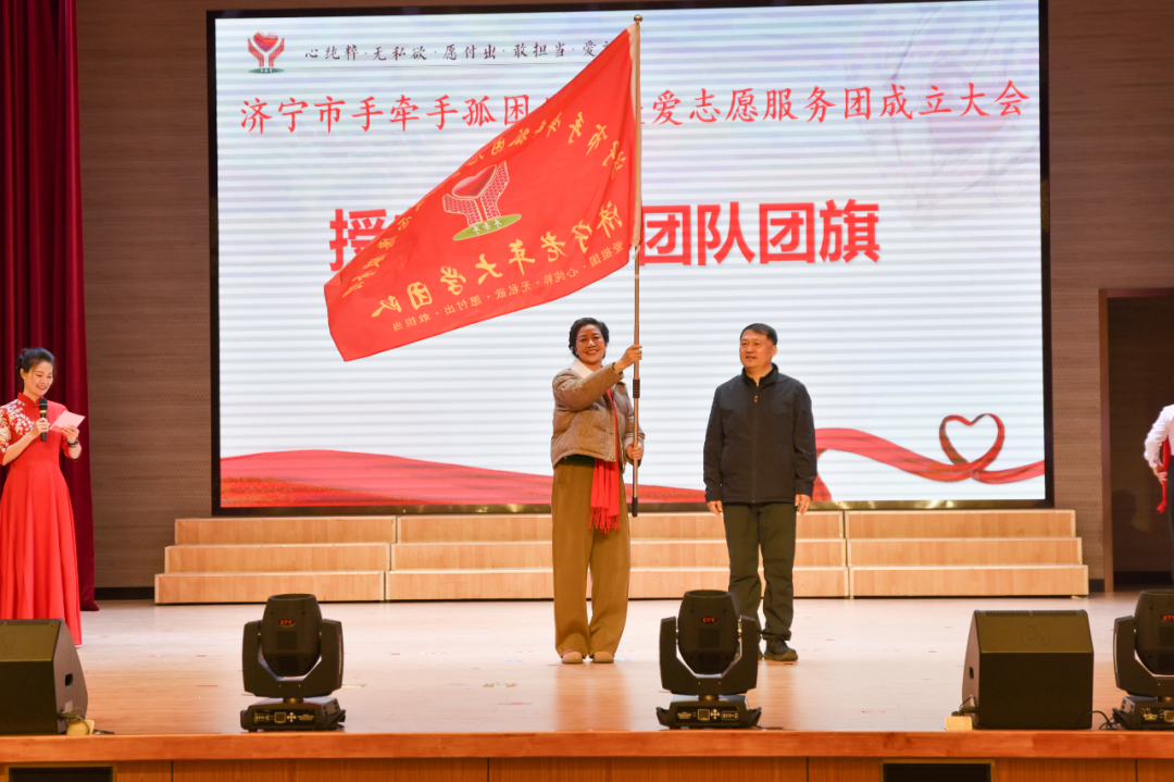 日前,济宁市手牵手孤困儿童关爱志愿服务团成立大会在济宁老年大学举行。会上,济宁市手牵手孤困儿童关爱志愿服务团济宁老年大学团队同步成立。市委社会工作部副部长汪巨龙为老年大学志愿服务团队授旗,济宁老年大学副校长李宁参加仪式并见证这一暖心时刻。