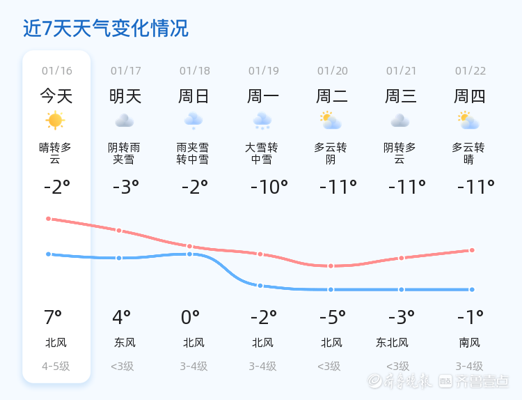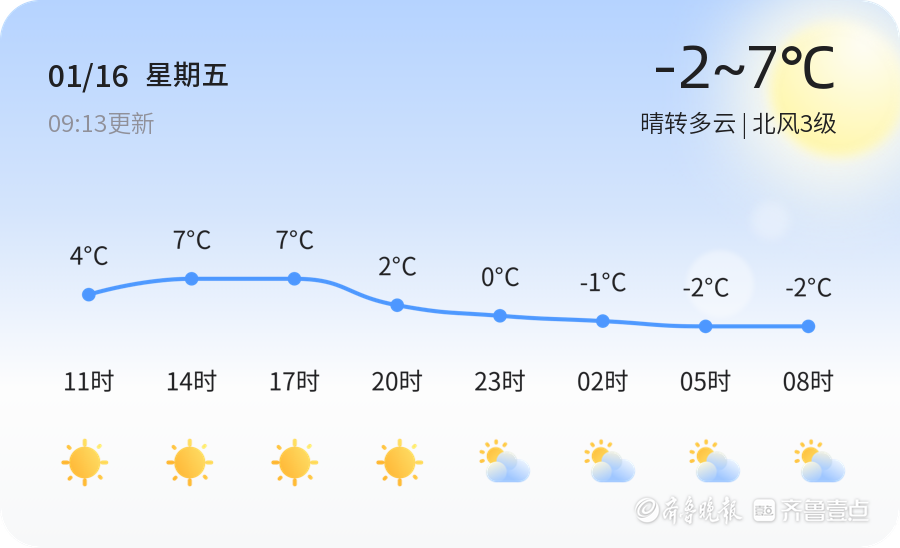 今天是1月16日,星期五,农历十一月廿八。菏泽市今天天气晴转多云,气温介于-2℃至7℃之间。各区普遍以晴转多云天气为主,北风3级,空气湿度较高,PM2.5指数为152,空气质量良好。