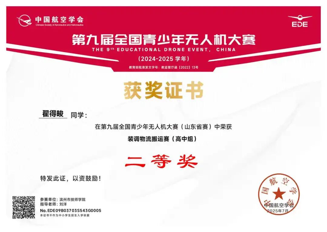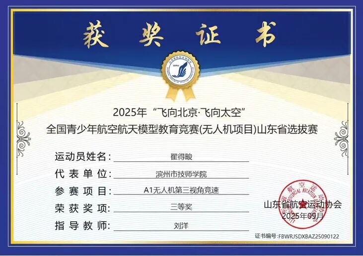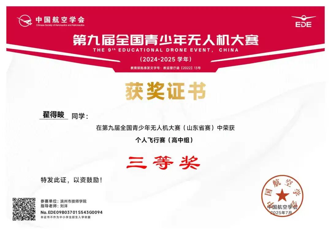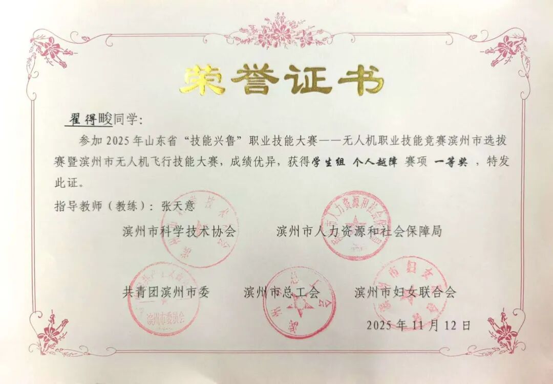 第二届滨州市中小学无人机大赛暨第九届全国青少年无人机大赛个人飞行赛一等奖