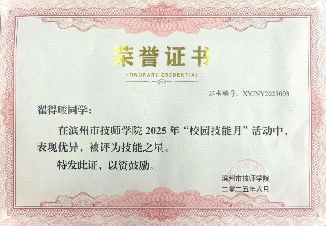翟得畯,滨州市技师学院2024级机电技术应用专业学生。中考时以超出高中录取分数线43分的成绩放弃就读普通高中,选择进入滨州市技师学院学习,2025年获得国家奖学金。