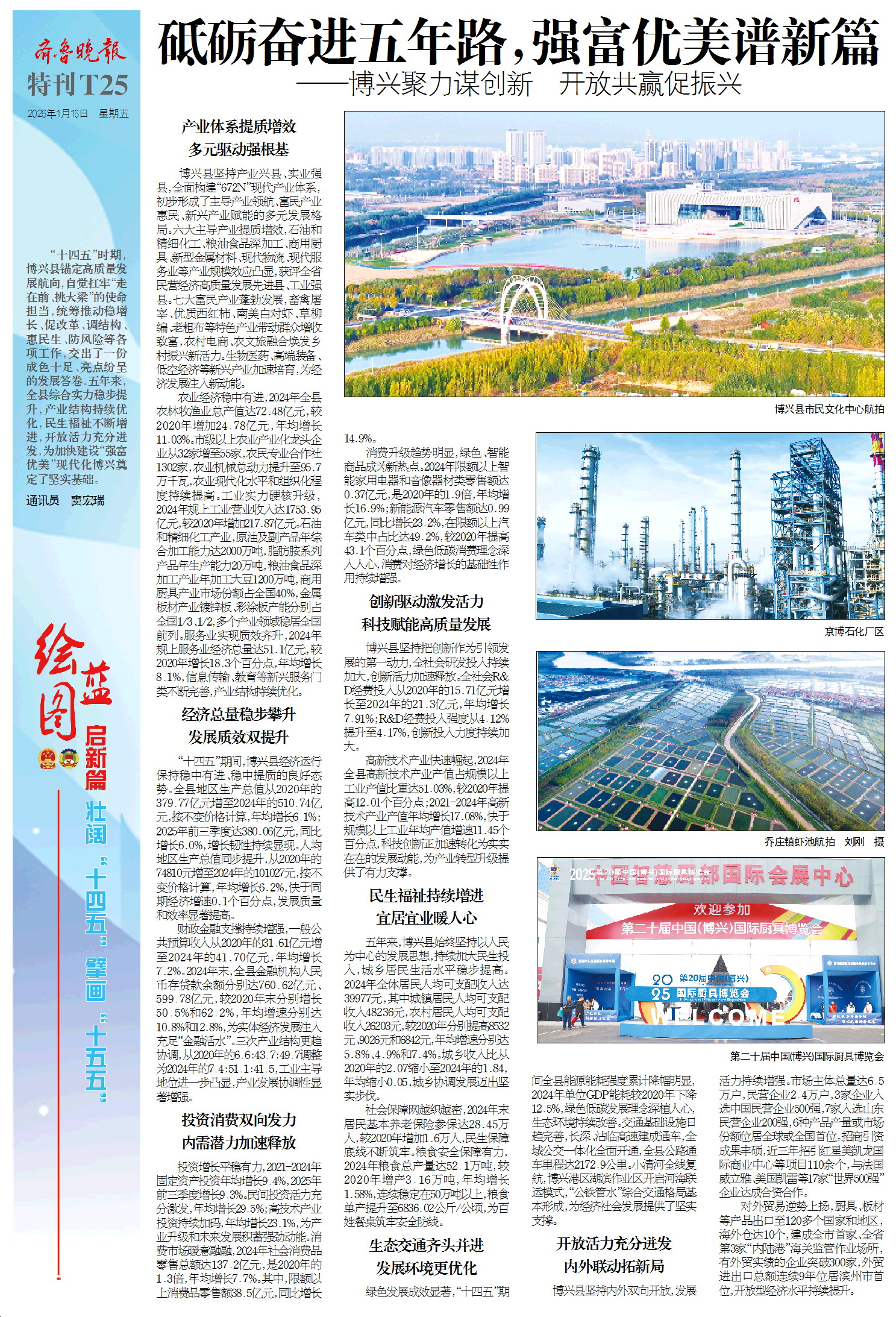 “十四五”时期,博兴县锚定高质量发展航向,自觉扛牢“走在前、挑大梁”的使命担当,统筹推动稳增长、促改革、调结构、惠民生、防风险等各项工作,交出了一份成色十足、亮点纷呈的发展答卷。五年来,全县综合实力稳步提升,产业结构持续优化,民生福祉不断增进,开放活力充分迸发,为加快建设“强富优美”现代化博兴奠定了坚实基础。
