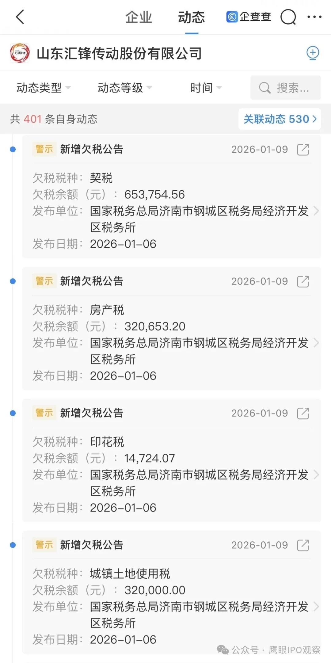 IPO辅导推进中,汇锋传动及多家子公司新增欠税披露