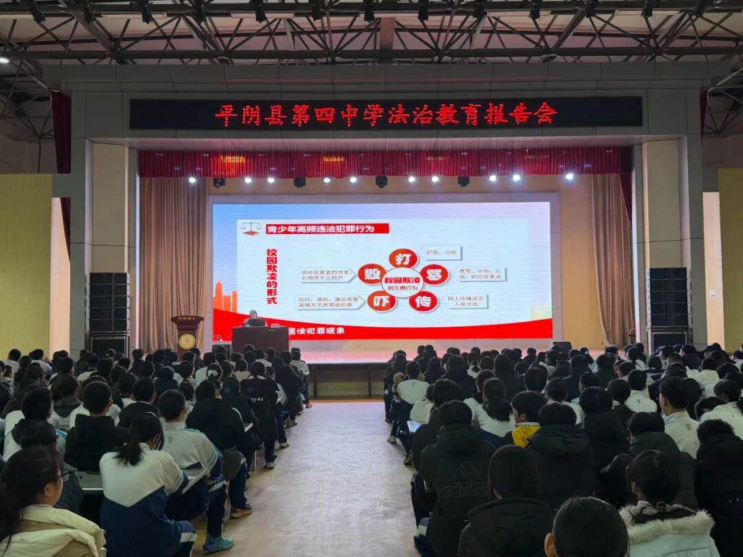 为增强青少年法治观念,从源头上预防和减少青少年违法犯罪行为,筑牢未成年人保护前沿防线,2026年1月14日平阴县人民法院刑事审判庭法官尹杰走进平阴县第四中学,以“成长路上 与法同行”为主题,为该校初二年级师生带来一场深刻而生动的专题法治讲座。