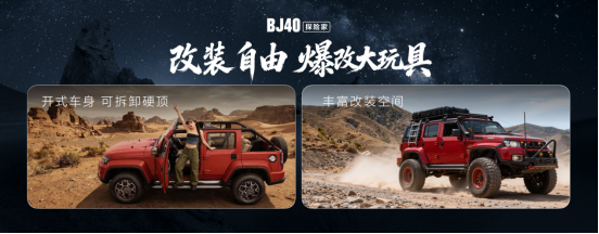 BJ40探险家是一个“爆改大玩具”,采用同级唯一快拆硬顶设计和开式车身,硬派越野可变身敞篷越野车;支持深度创意,是一个容纳千种玩法、万般想象的潮流生活伙伴。