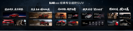 北京越野董事长王昊表示,BJ40作为中国越野的领路者,亲历过无数盛事荣耀,也成为中国汽车的独特文化符号,在全球用户的认可中走入了万千家庭。BJ40以探险家的名义,开启全新征程,在经典设计、自由改装、专业性能、极致安全和跨圈舒适五大维度再造新经典,为中国越野车市场再造经典专业越野SUV。