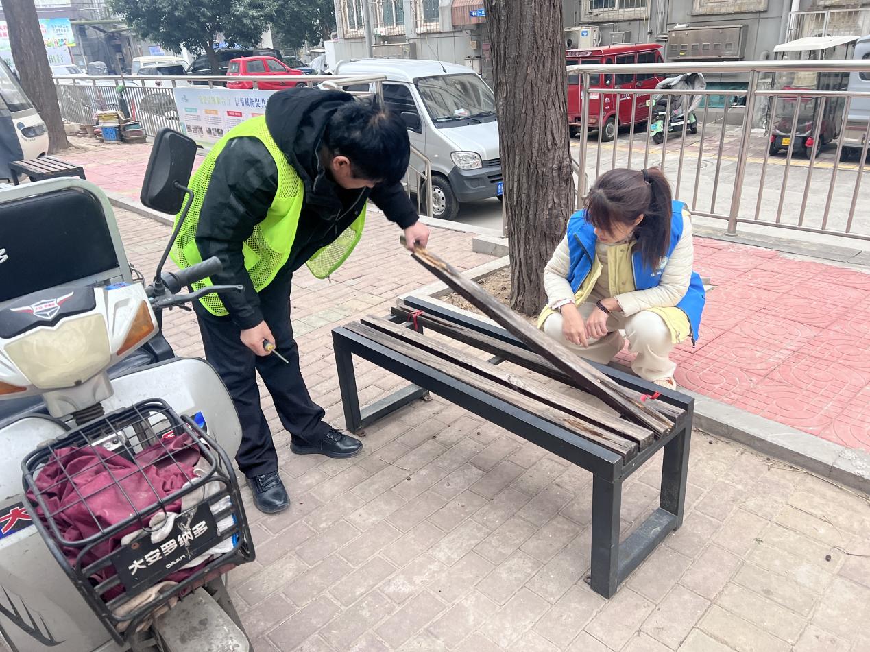 活动现场,退役军人志愿者带着工具来到公共座椅旁,仔细检查座椅的损坏情况,经过一番努力,原本摇晃、破损的公共座椅被修复得稳固又美观,重新焕发出“活力”。
