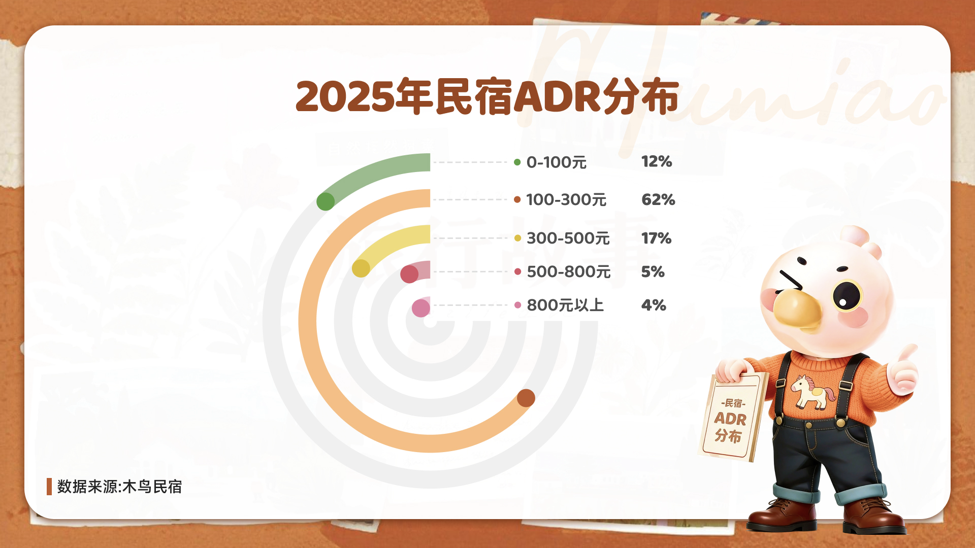 在用户需求侧,2025年呈现出鲜明的橄榄型结构特征。今年客单价与间夜价均较为稳定,100元以下的民宿ADR(已售客房平均房价)数量占比12%,100-300元的民宿ADR数量占比62%,300-500元的民宿ADR数量占比17%,500-800元的民宿ADR数量占比5%,800元以上的民宿ADR数量占比4%。用户“体验性消费”同步增长,三亚、万宁、陵水、儋州、西双版纳、大连、日照、乌鲁木齐、湖州、舟山、乐山、丽水等地中高端住宿消费热度位居前列,三亚、陵水、西双版纳等地单均消费万元以上的旅居用户占比显著提升。