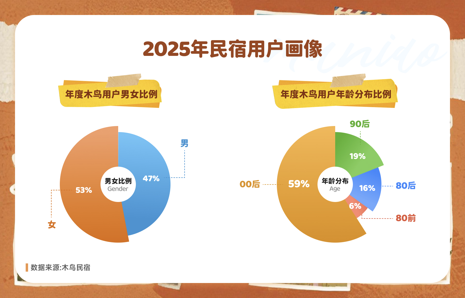 报告显示,2025年木鸟民宿女性用户订单占比为53%,女性用户人均民宿消费比男性高出23%,她们更追求个性化、独特的旅行体验。从年龄上看,00后用户占比为59%,90后用户占比为19%,80后用户占比为16%,80前用户占6%。00后占比近六成,成为民宿消费的核心力量。