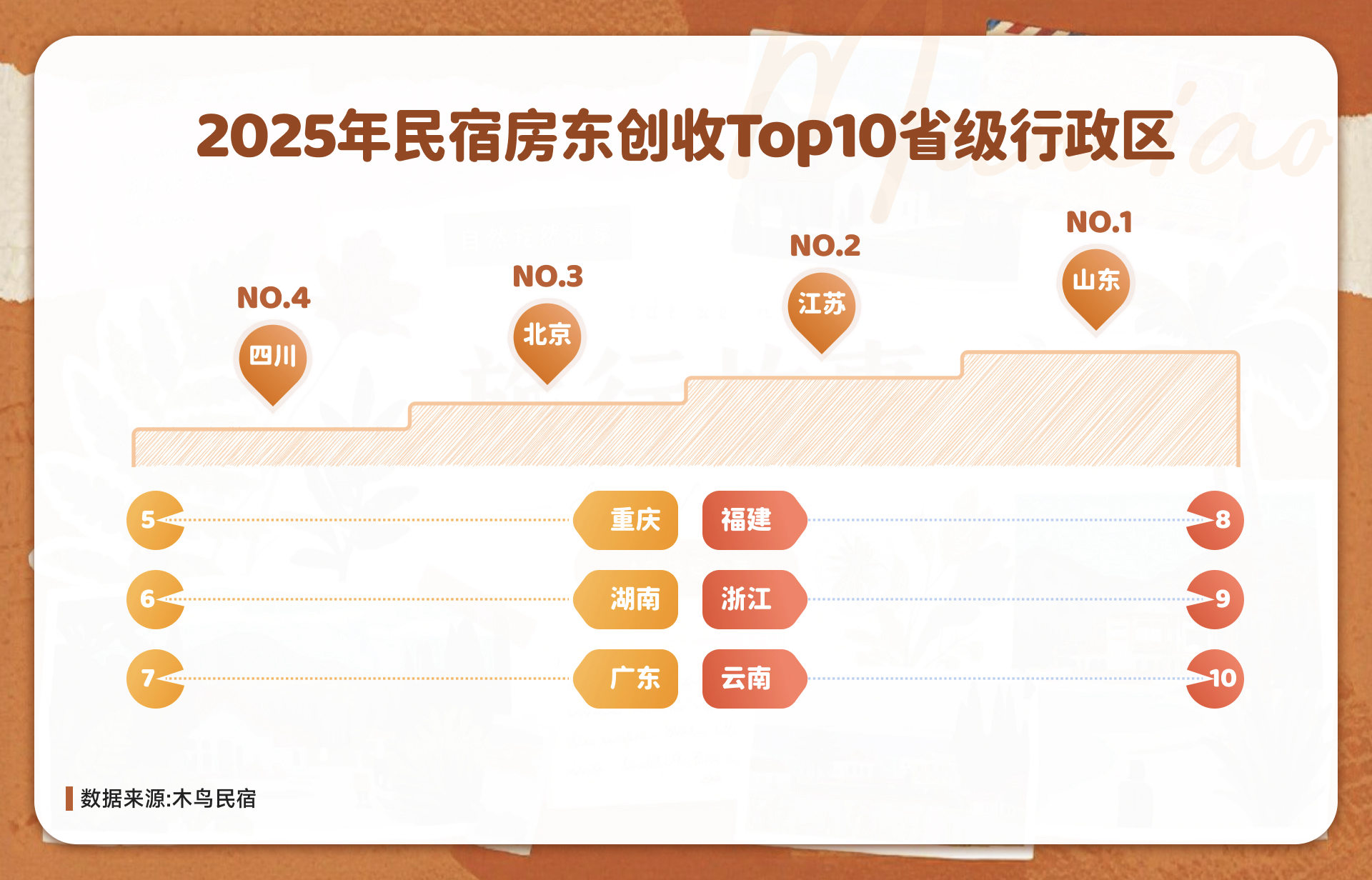 2025年民宿房东创收Top10省级行政区分别为:山东、江苏、北京、四川、重庆、湖南、广东、福建、浙江、云南。新疆、贵州、河南成为2025年订单增速最快省份。
