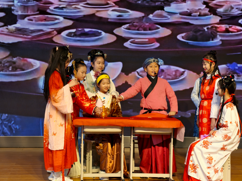 “唱好歌”环节,中国元素与英文歌曲巧妙融合。一曲《Motherland & Snow Dragon》节奏明快,搭配灵动手势舞,展现国韵与童趣;《A little love》合唱清澈真挚,传递出情感共鸣与合作力量。