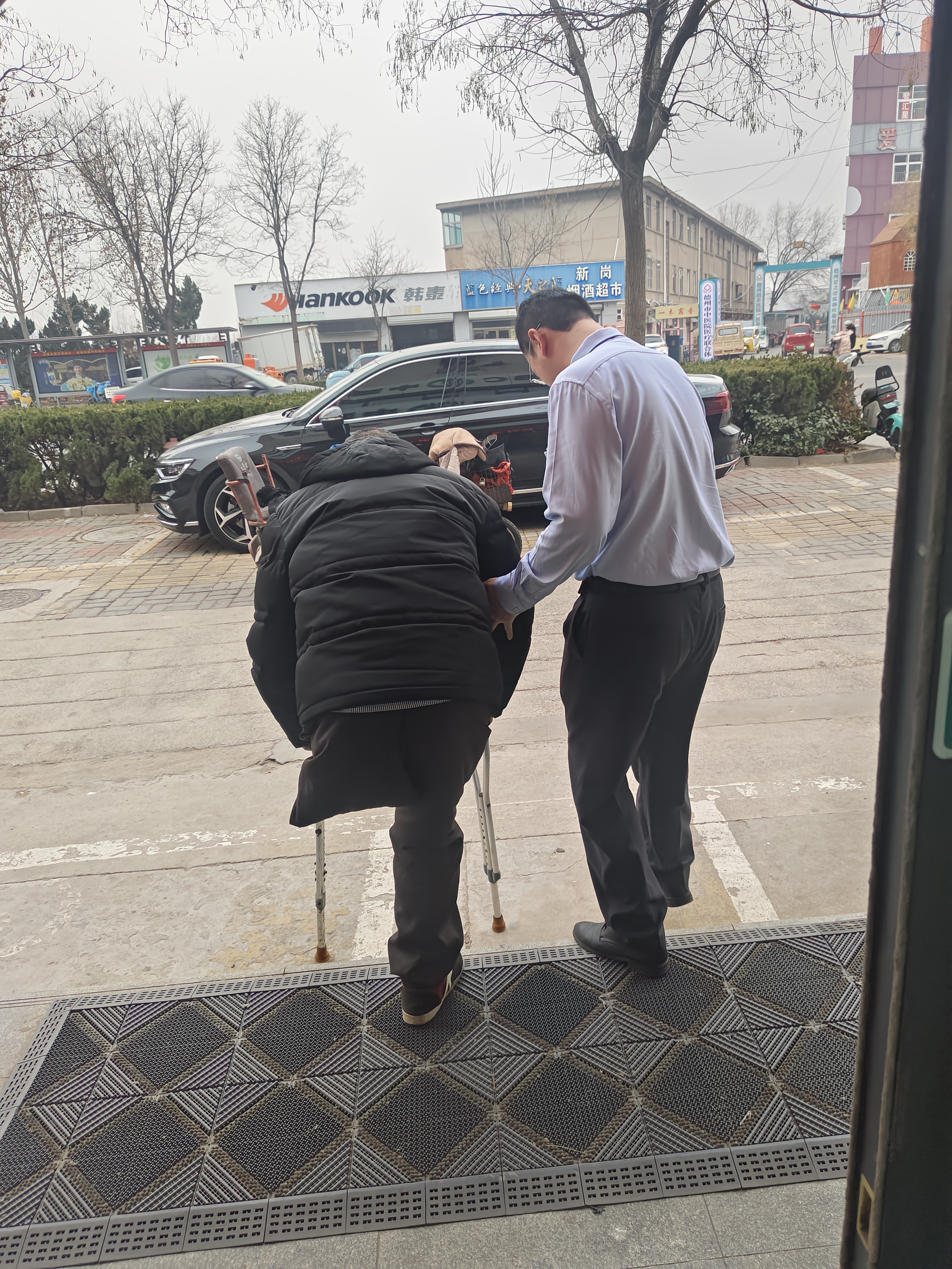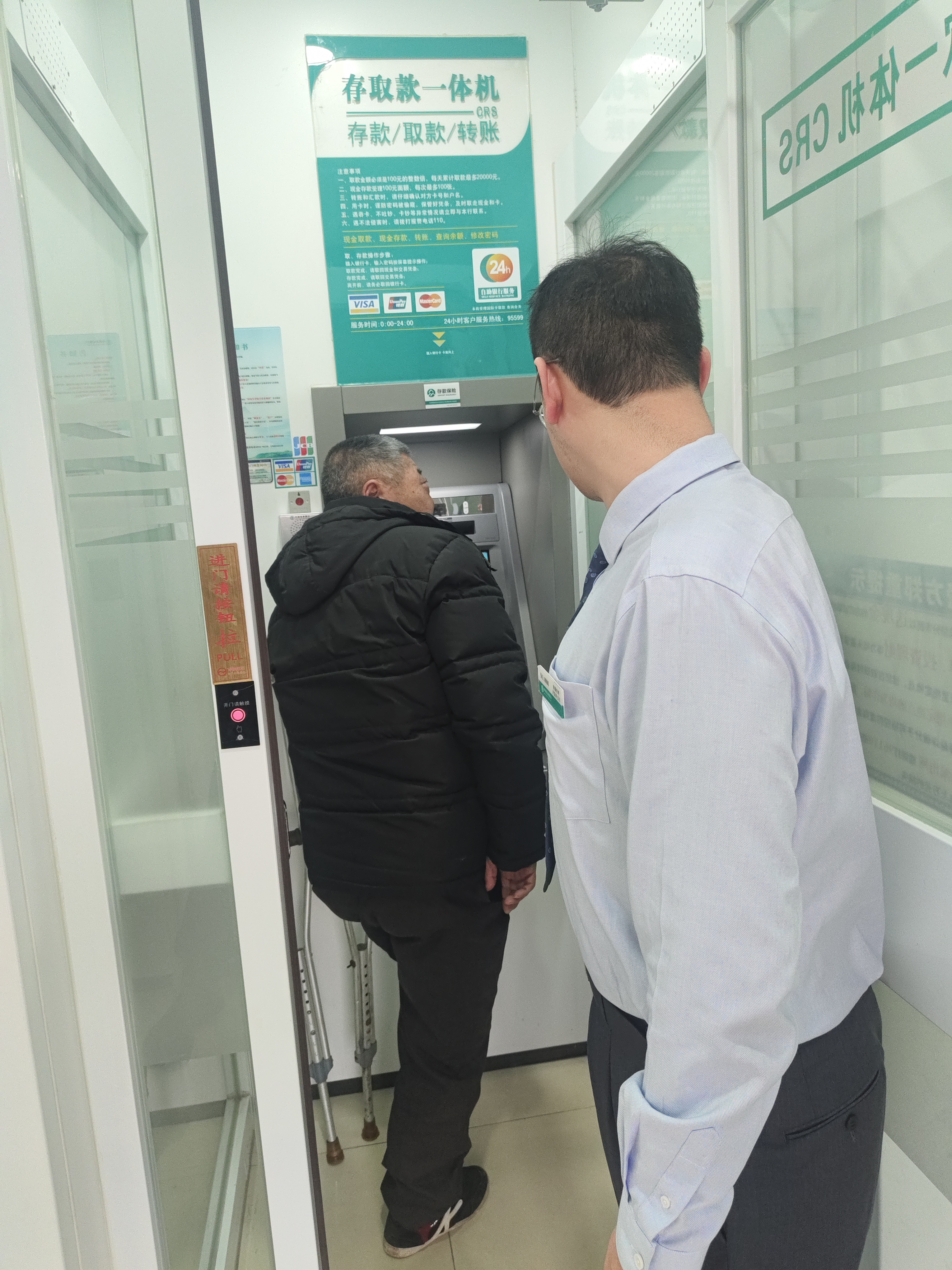 老人拄着拐杖,步履艰难。小许小心搀扶着他,从门口慢慢走进营业厅,一路耐心陪伴、细心照应。
