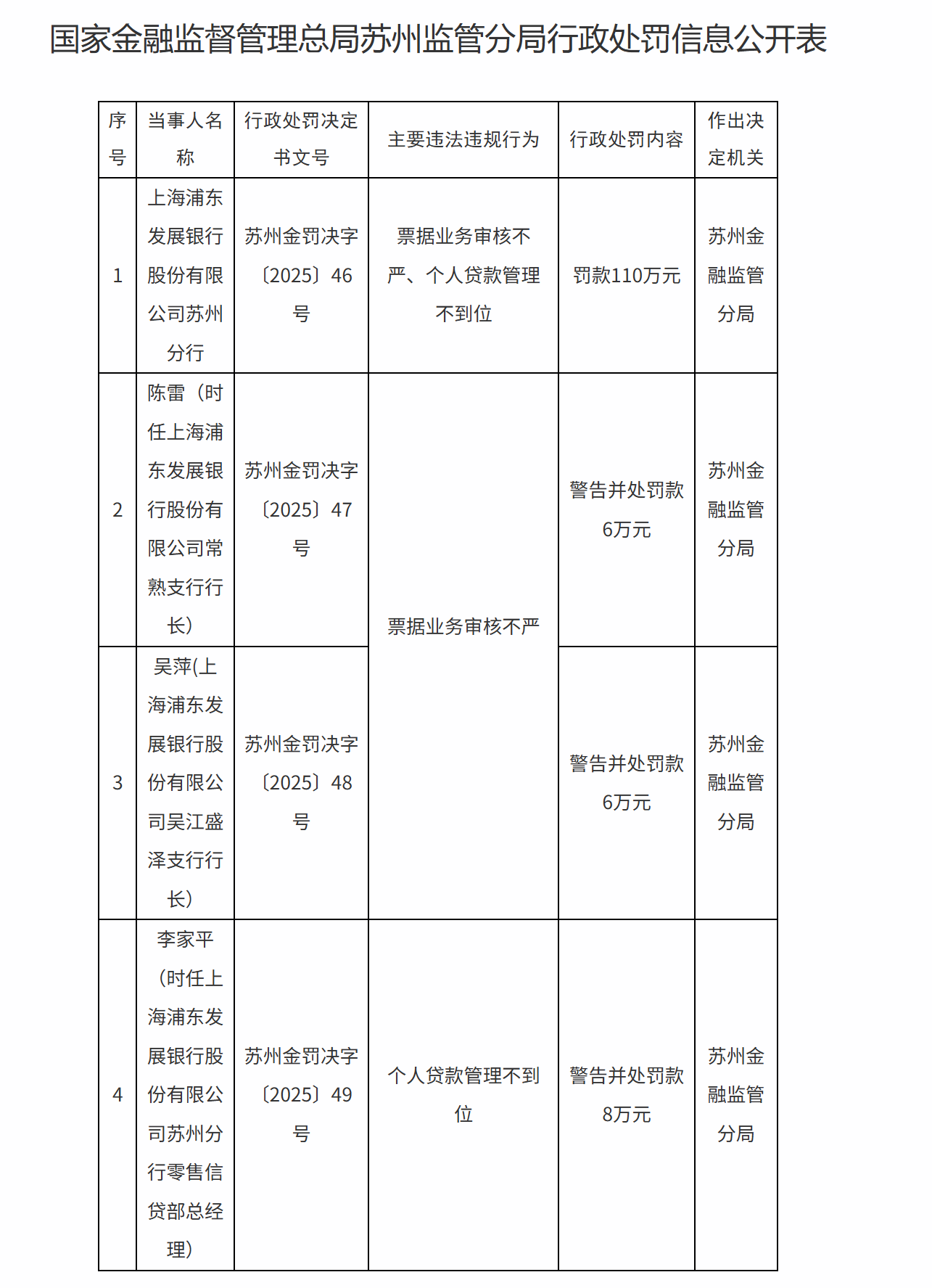近日,国家金融监督管理总局苏州监管分局行政处罚信息公开表显示,因票据业务审核不严、个人贷款管理不到位,上海浦东发展银行股份有限公司(下称“浦发银行”)苏州分行及相关负责人被行政处罚。
