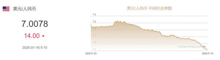据中国外汇交易中心网站消息,中国人民银行授权中国外汇交易中心公布,2026年1月16日银行间外汇市场人民币对美元中间价报7.0078元,下调14个基点。图片来源:中国外汇交易中心网站截图