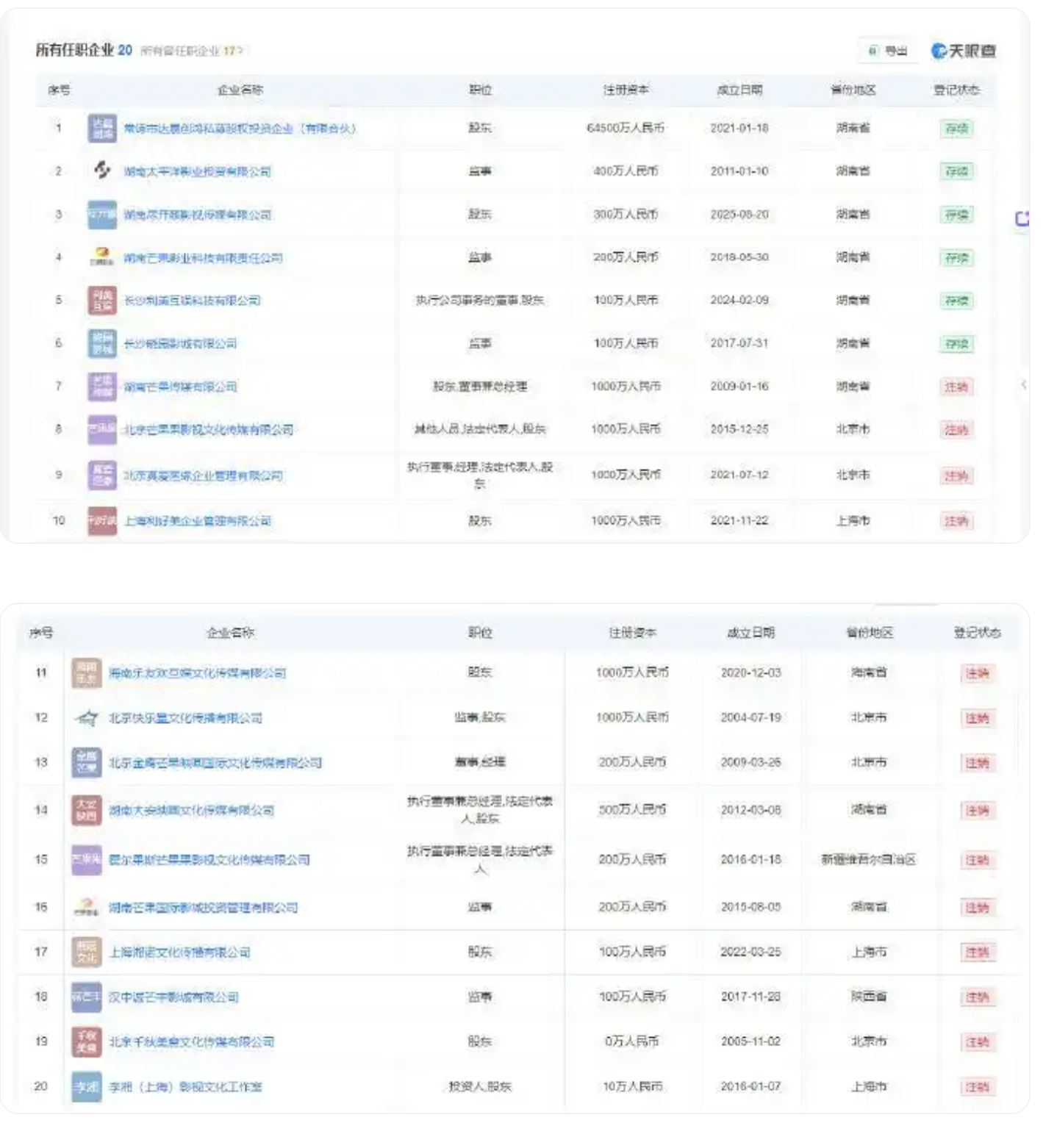 据红星新闻,李湘名下关联20家企业,其中14家已注销,仅6家企业续存。