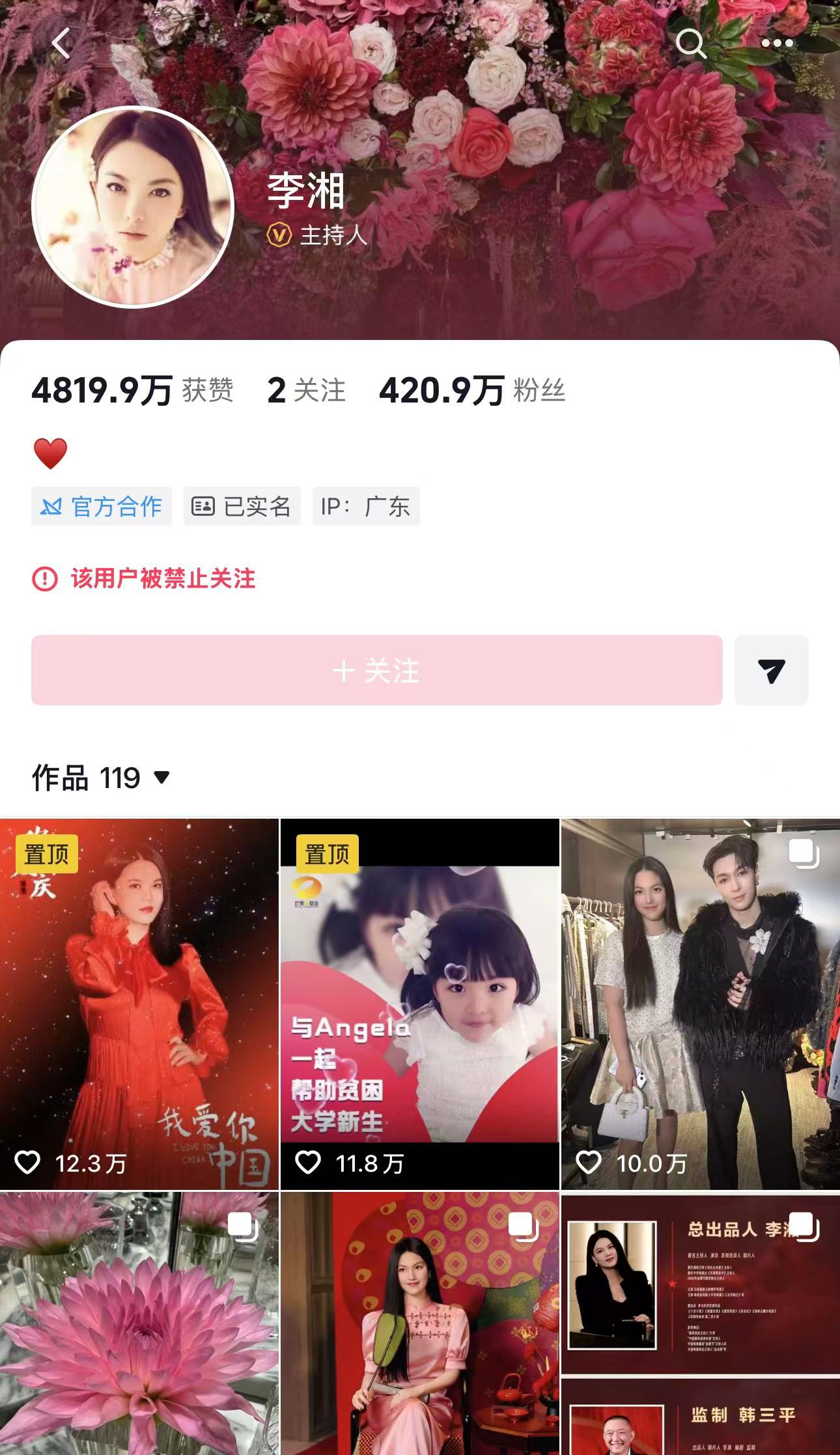 1月16日上午,记者发现,李湘抖音账号已被禁止关注。