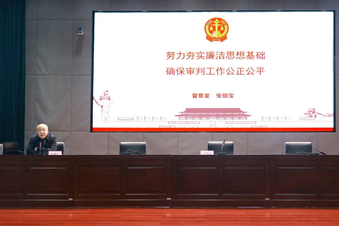 市中院督查室主任张佃宝以“努力夯实廉洁思想基础 确保审判工作公正公平”为主线,为全体干警带来一堂深刻的廉政教育课。他结合当前党风廉政建设的新形势、新要求,从违纪违法问题的主要特点、反腐倡廉的严峻形势、反面典型案事例等五个方面,教育引导干警践行初心使命,永葆清正廉洁的政治本色。