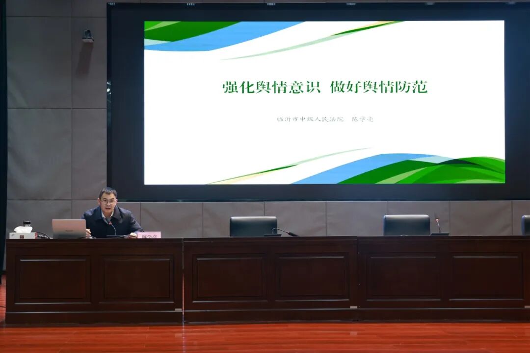 市中院宣传处处长、四级调研员陈学亮以“强化舆情意识、做好舆情防范”为题,结合新媒体传播特点,深入剖析当前网络舆情态势与规律,通过典型案例讲解,在精准识别舆情隐患、规范处置流程、提升办案质效等方面,指导干警建立起舆情应对的专业思维与能力,为筑牢新时代司法舆论安全防线提供了有力指导。
