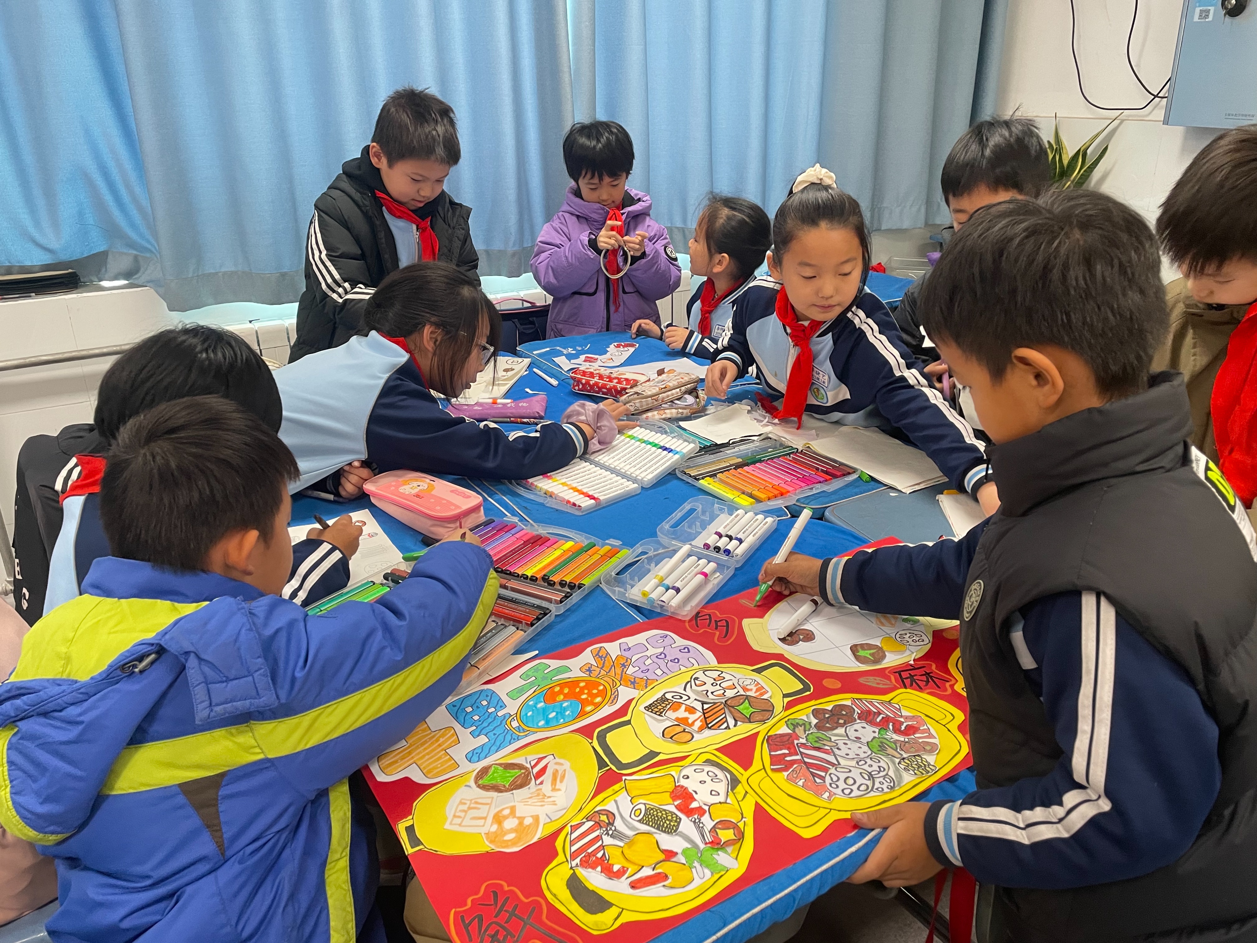 分享结束后,绘画环节率先开启。同学们化身“小小美食家”,手持彩笔在画纸上尽情挥洒创意。红通通的火锅冒着袅袅热气,仿佛能听见“咕嘟咕嘟”的沸腾声;翠绿的青菜、橙黄的玉米、粉嫩的香肠、雪白的金针菇错落摆放,色彩搭配鲜艳夺目;每一笔都充满童趣,每一幅画都独具创意,同学们用画笔将对美食的喜爱、对团圆的期盼一一定格。