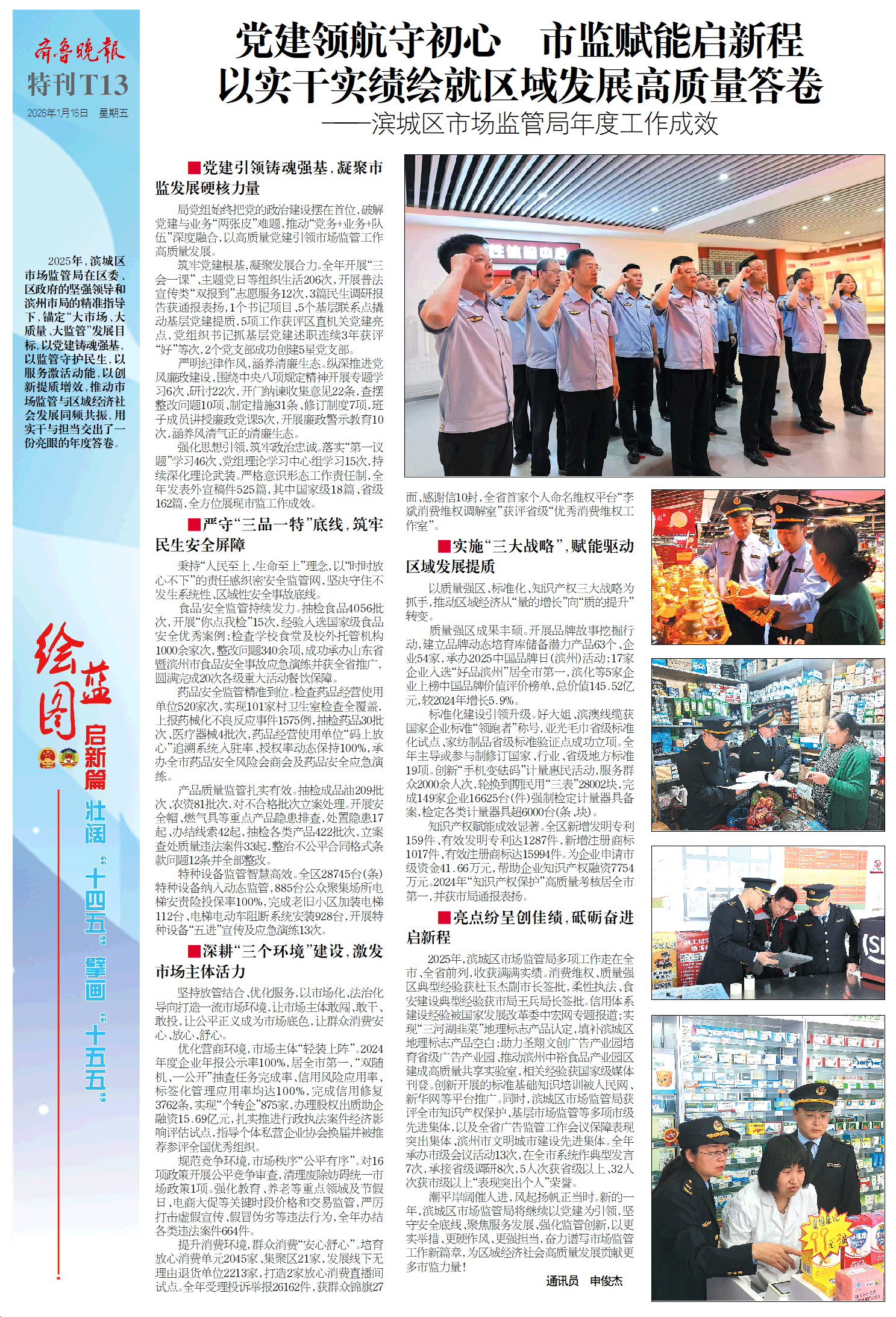 2025年,滨城区市场监管局在在区委、区政府的坚强领导和滨州市局的精准指导下,锚定“大市场、大质量、大监管”发展目标,以党建铸魂强基,以监管守护民生,以服务激活动能,以创新提质增效,推动市场监管与区域经济社会发展同频共振,用实干与担当交出了一份亮眼的年度答卷。