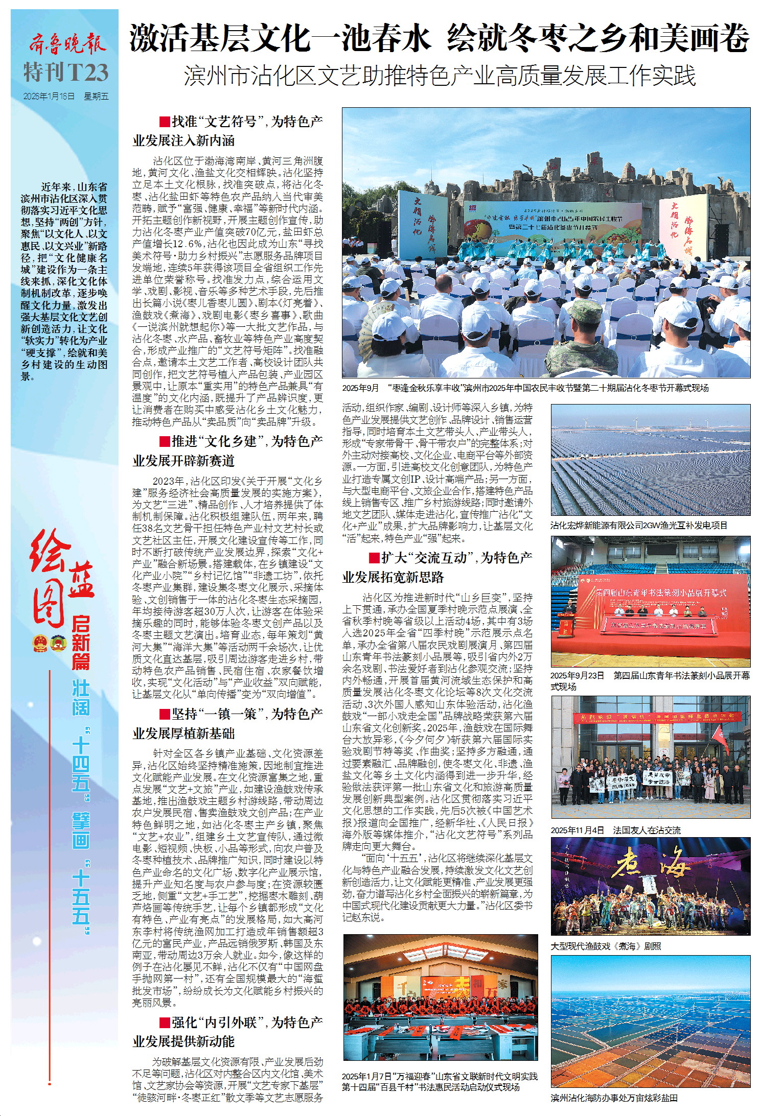 沾化区为推进新时代“山乡巨变”,坚持上下贯通,承办全国夏季村晚示范点展演、全省秋季村晚等省级以上活动4场,其中有3场入选2025年全省“四季村晚”示范展示点名单,承办全省第八届农民戏剧展演月、第四届山东青年书法篆刻小品展等,吸引省内外2万余名戏剧、书法爱好者到沾化参观交流;坚持内外畅通,开展首届黄河流域生态保护和高质量发展沾化冬枣文化论坛等8次文化交流活动、3次外国人感知山东体验活动,沾化渔鼓戏“一部小戏走全国”品牌战略荣获第六届山东省文化创新奖。2025年,渔鼓戏在国际舞台大放异彩,《今夕何夕》斩获第六届国际实验戏剧节特等奖、作曲奖;坚持多方融通,通过要素融汇、品牌融创,使冬枣文化、非遗、渔盐文化等乡土文化内涵得到进一步升华,经验做法获评第一批山东省文化和旅游高质量发展创新典型案例。沾化区贯彻落实习近平文化思想的工作实践,先后5次被《中国艺术报》报道向全国推广,经新华社、《人民日报》海外版等媒体推介,“沾化文艺符号”系列品牌走向更大舞台。