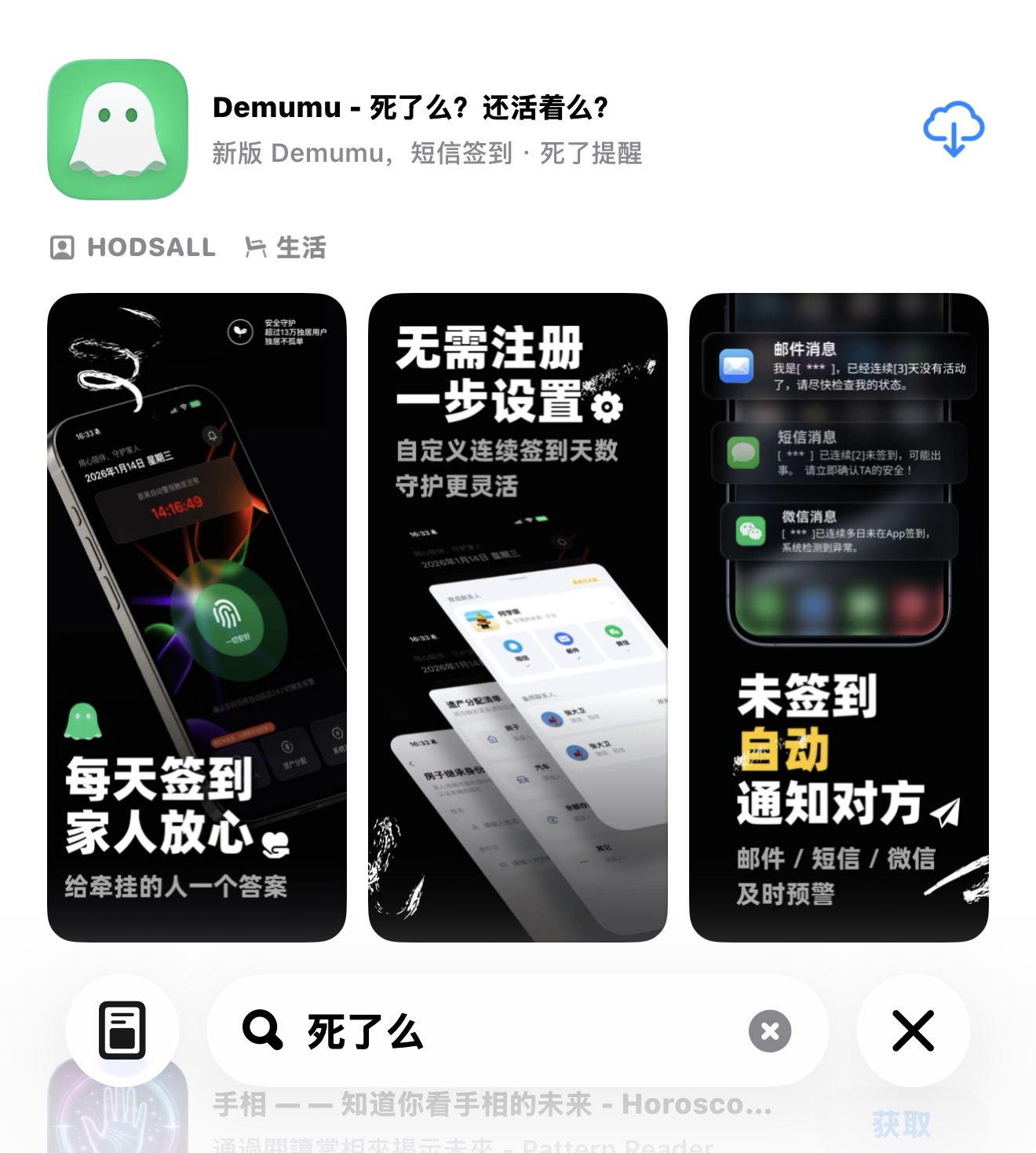 随后,“活着么”等类似独居安全提醒App也在苹果应用商店上架。