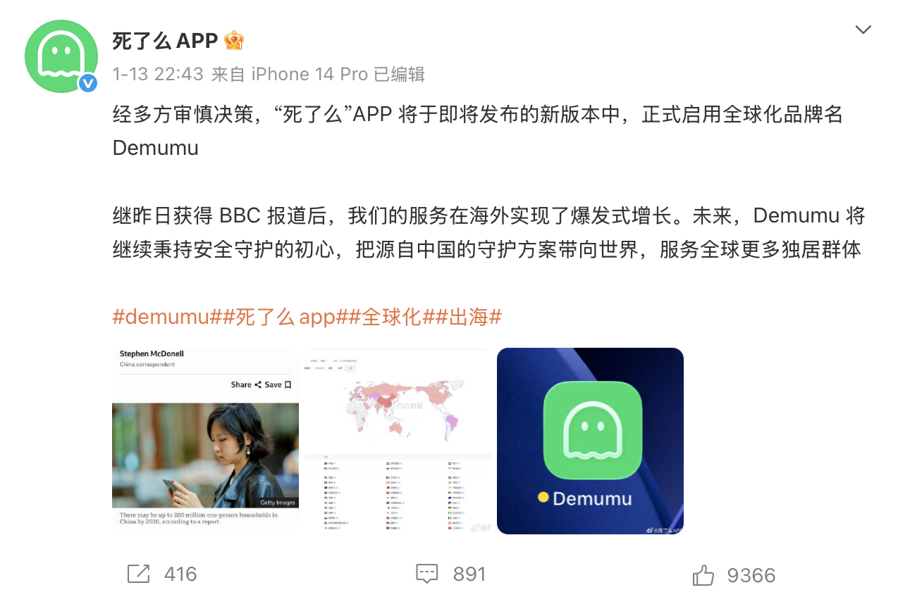 1月13日,“死了么”官方微博突然发布消息称,将于即将发布的新版本中正式启用全球化品牌名Demumu。